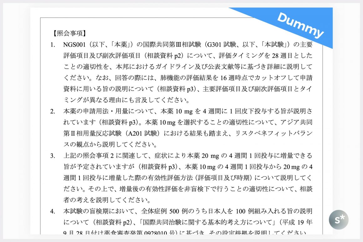 その内容を確認し、説明不足や意味不明な点を「照会事項」としてまとめて製薬企業に聞きます。雑なダミーですが、以下のようなイメージです。