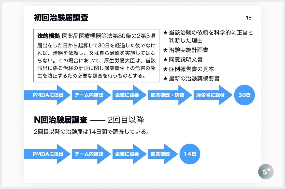 その治験薬を用いた治験が2回目以降の場合は、2回目だったら2回治験届、3回目だったら3回治験届、というように、製薬企業は「○回治験届」をPMDAに提出します。この調査は必要に応じて14日間で行われ、「N回届調査」とよばれます。