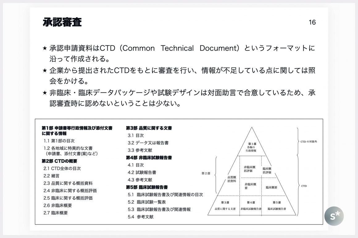 製薬企業が承認申請するときは、その資料を「CTD(Common Technical Document)」という形式に沿ってまとめなければなりません。これは日米欧で共通化されたフォーマットであり、第1部(モジュール1)〜第5部(モジュール5)から成っています。