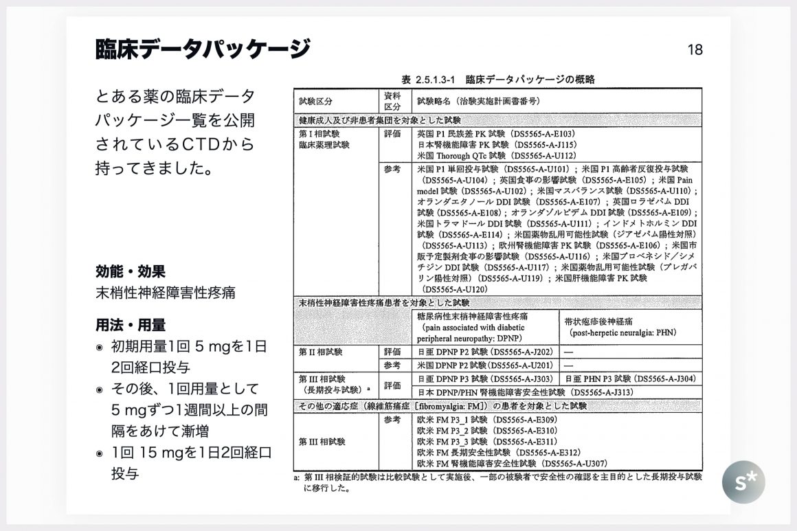 臨床データパッケージは対面助言であらかじめ合意しておくことが多いです。例として、「タリージェ」という薬のCTDの一部がPMDAのサイトで公表されていたので持ってきました。ここまで多数の試験で構成されることは少ないですが、一例としてご参考にどうぞ。