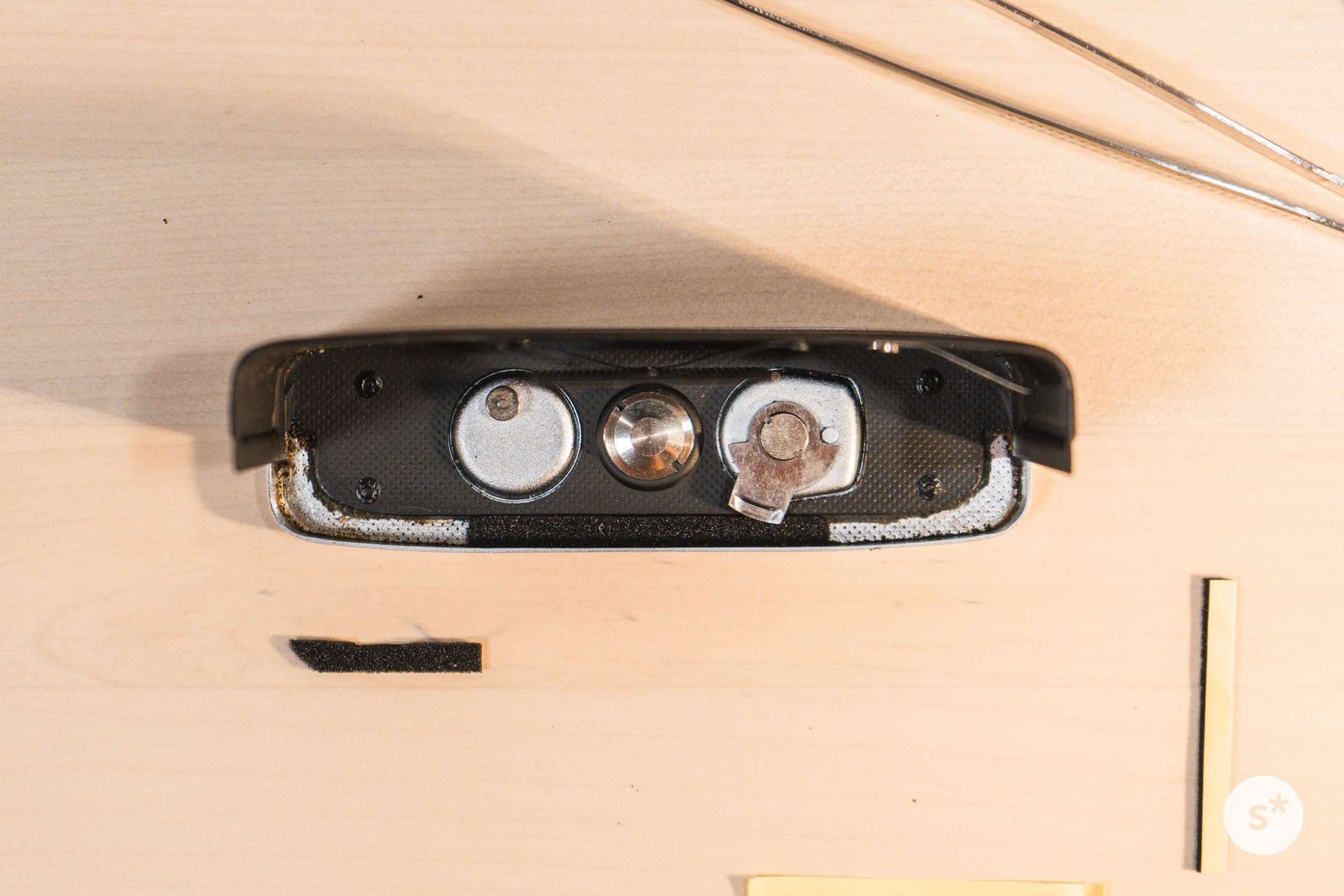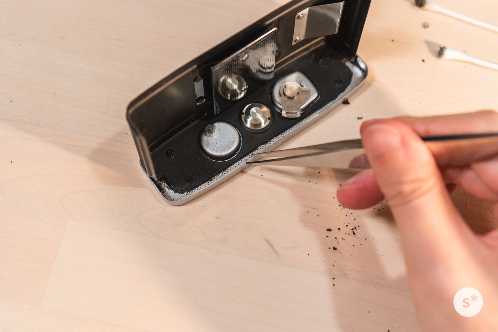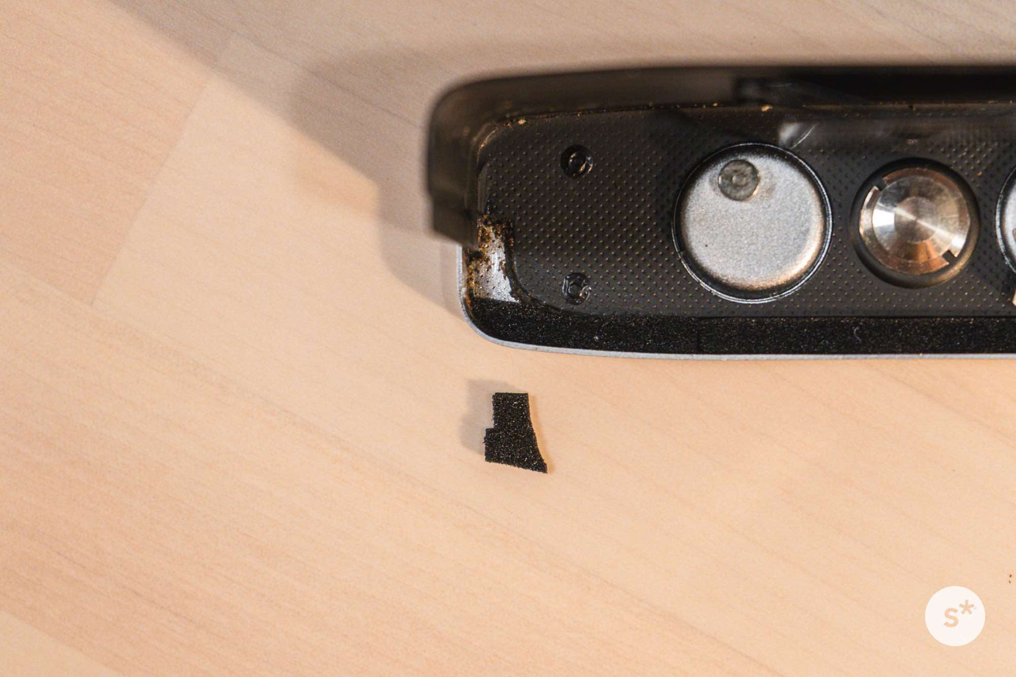 劣化していたのは、フィルム室内に光が漏れ入るのを防止する「モルト」という部品。その実体は厚さ1〜2mmの黒いスポンジなのですが、スポンジであるが故に経年劣化でボロボロになってしまうのです。