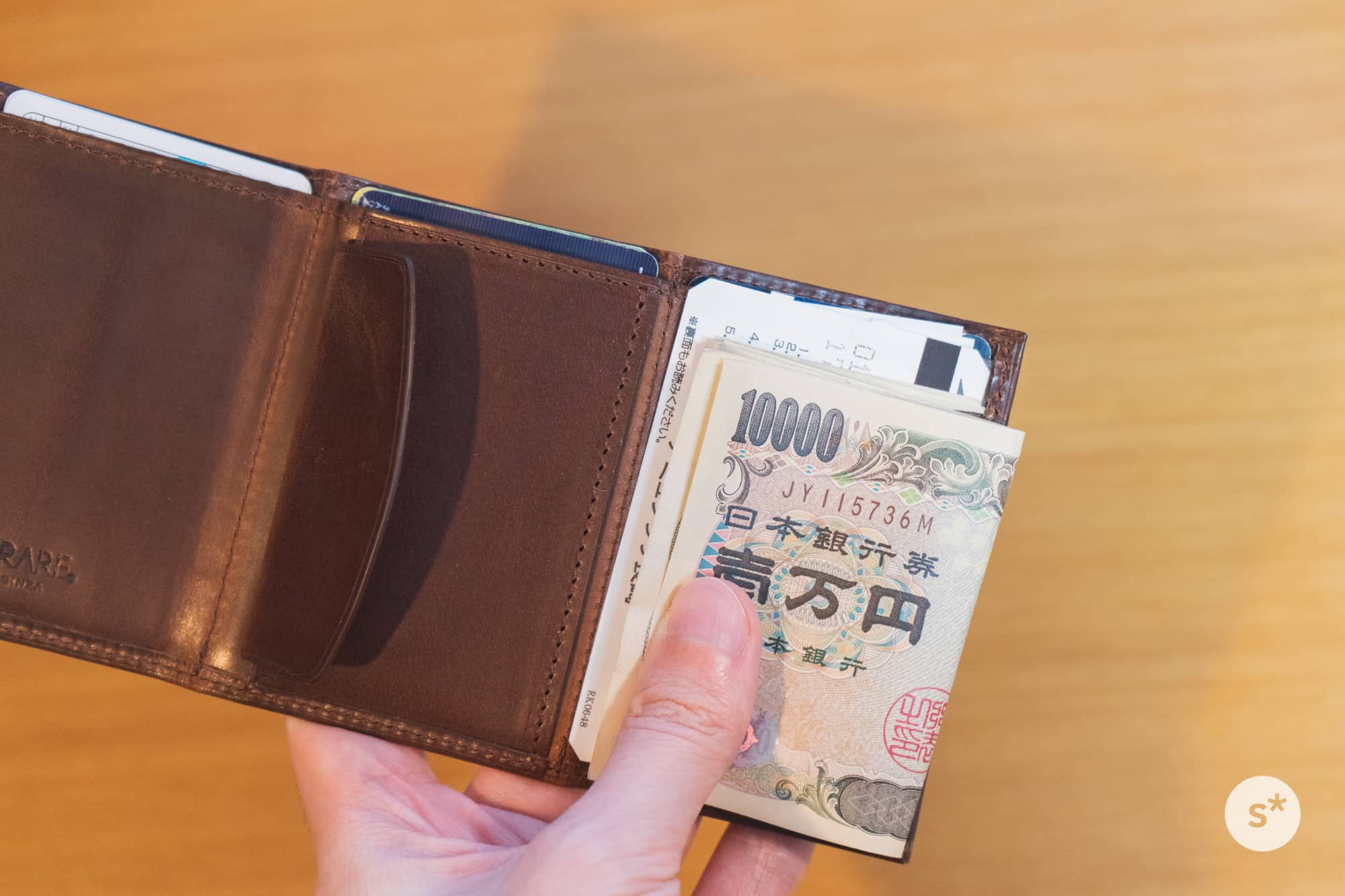 が収納可能です。普段はApple Payやクレジットカードで決済し、できるだけ現金を使いたくないという開発者の意図がひしひしと伝わってきます。