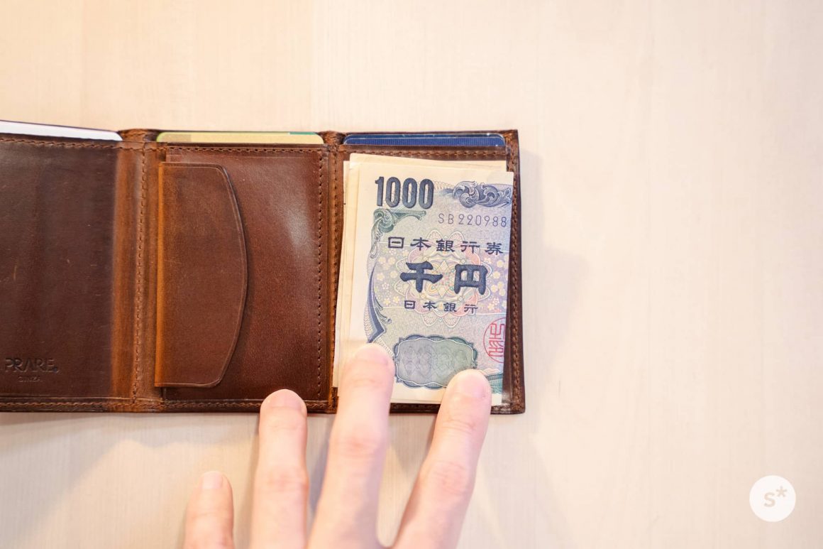 その上から、普段使い用の千円札をポケットに引っかけ、ポケット外で三つ折りにして収納しています。三つ折りにしてからポケットに入れ込むよりも、この方が使いやすいのです。