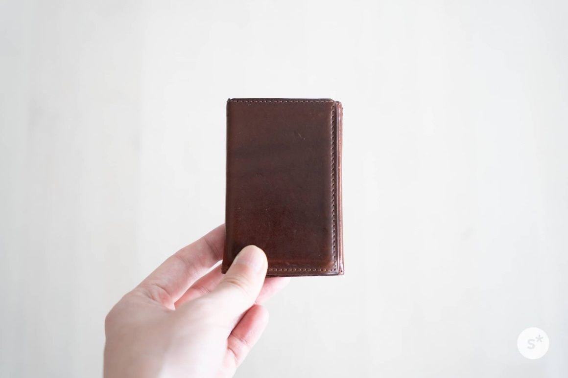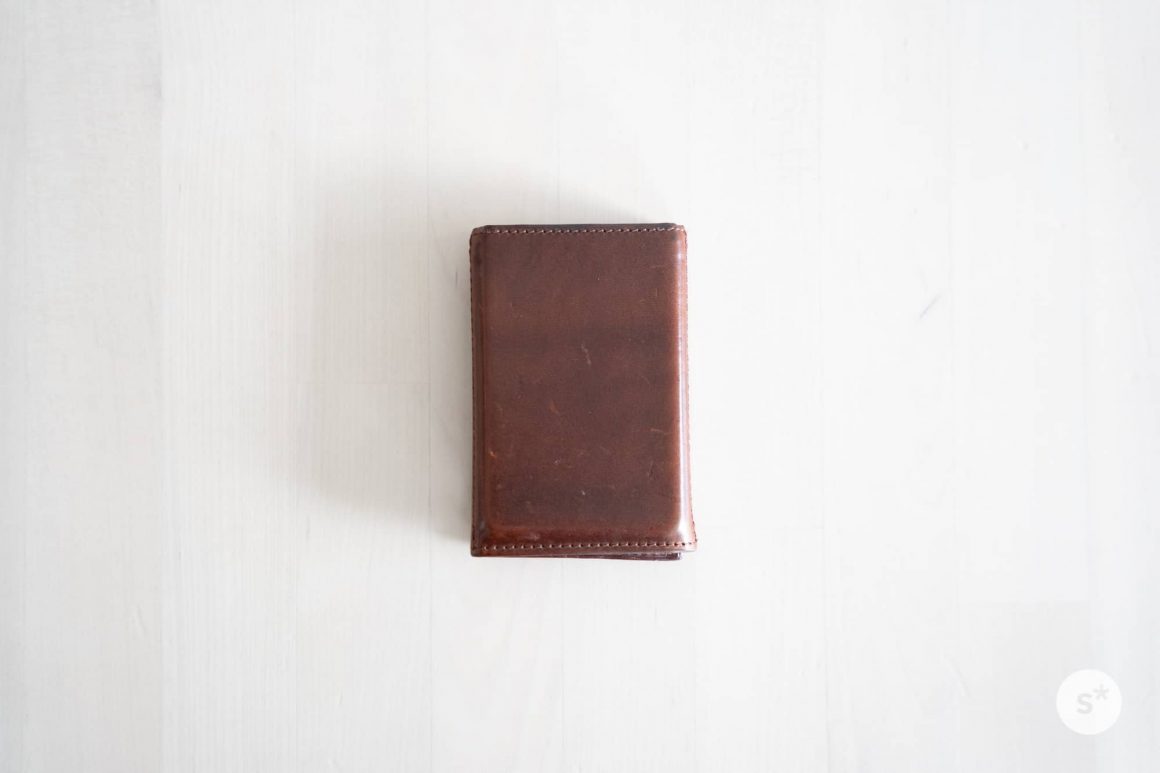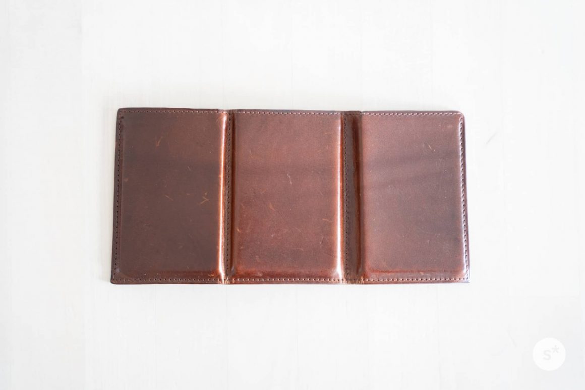 2年経過後の外観は、1年経過時と大して変わりません。購入時から少しずつ革が広がっていき、カードの型がつくのが4か月くらいなので、大きく変化するのは4か月まで。それ以降の変化のスピードは鈍くなっていきます。ただ、傷がついて、それが少しずつ馴染んでいって、というのを繰り返す中で、細かい模様は刻一刻と変わっていきます。
