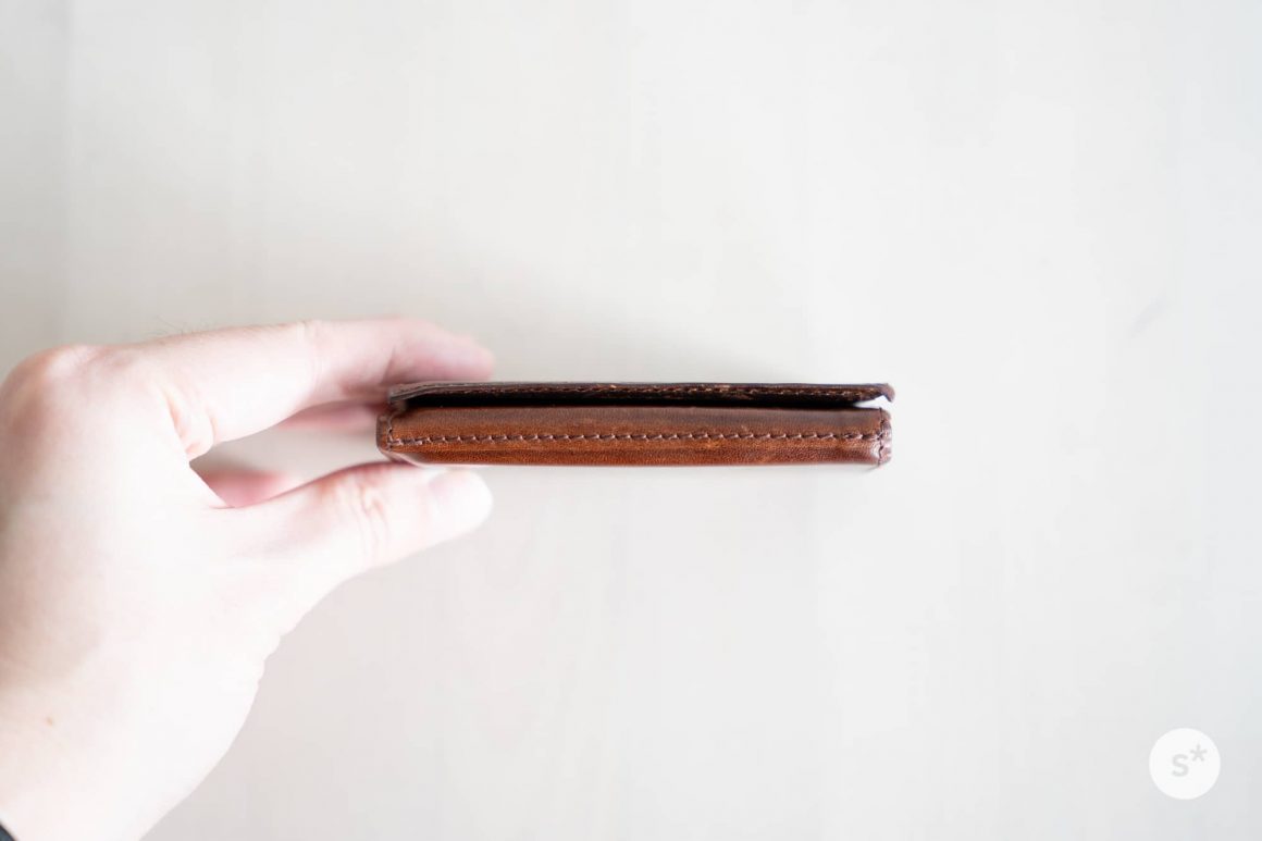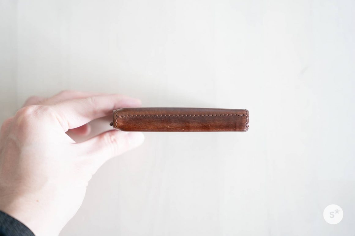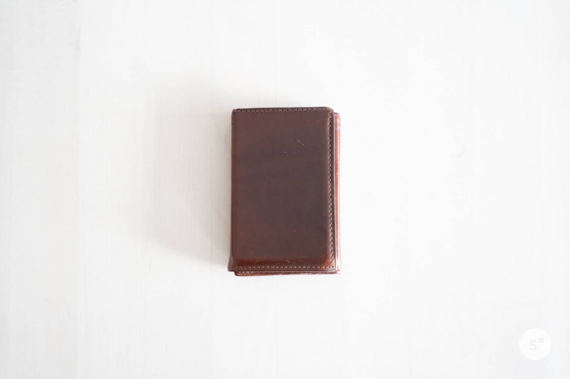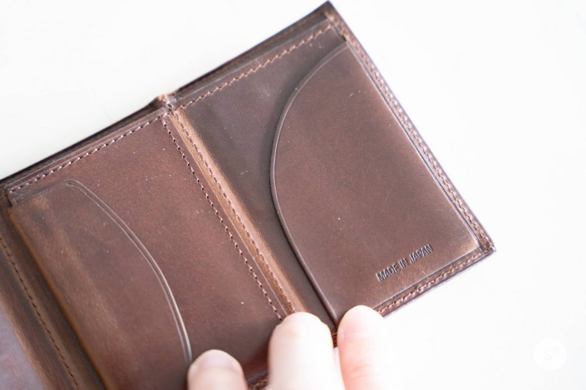 2年経過後の外観は、1年経過時と大して変わりません。購入時から少しずつ革が広がっていき、カードの型がつくのが4か月くらいなので、大きく変化するのは4か月まで。それ以降の変化のスピードは鈍くなっていきます。ただ、傷がついて、それが少しずつ馴染んでいって、というのを繰り返す中で、細かい模様は刻一刻と変わっていきます。