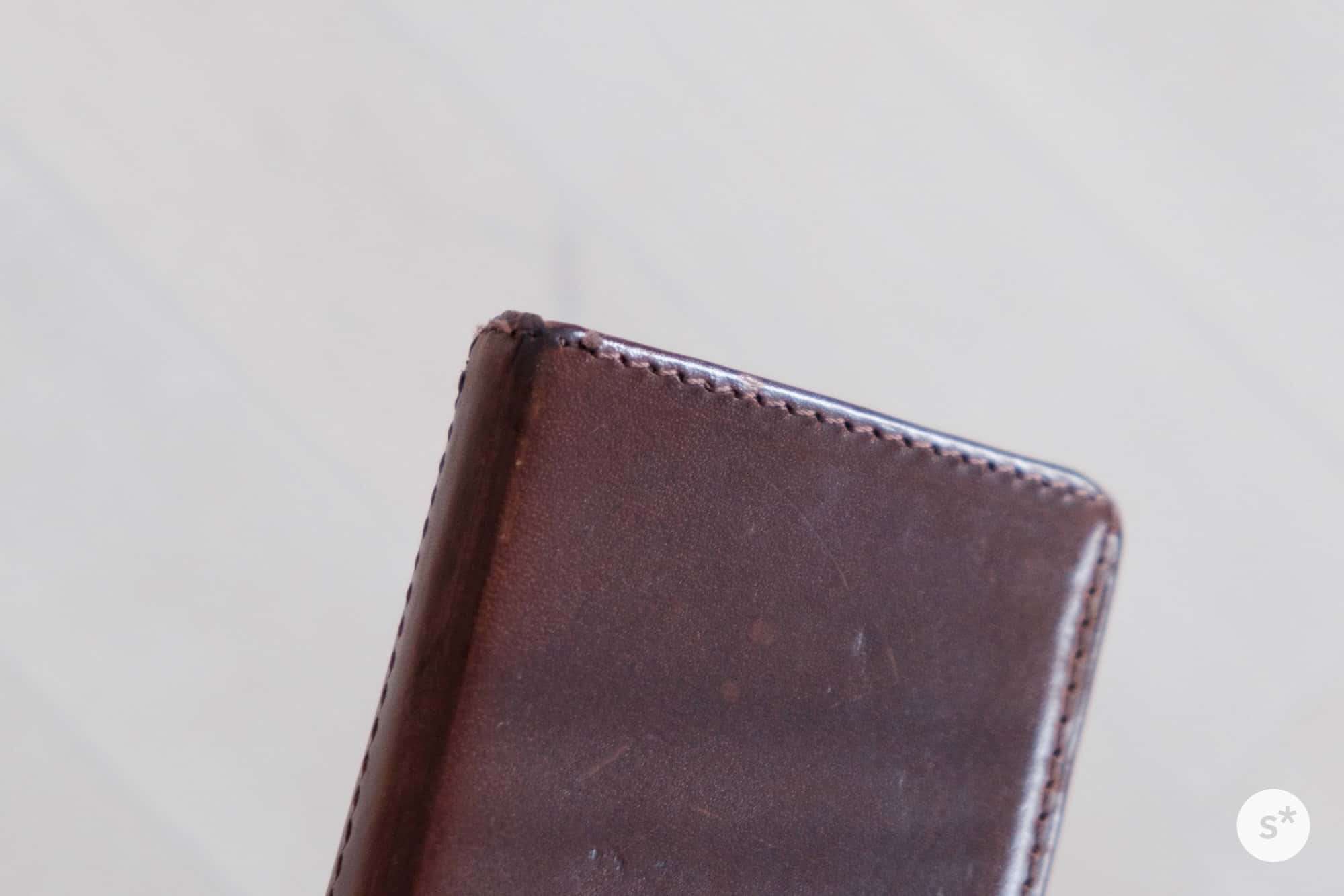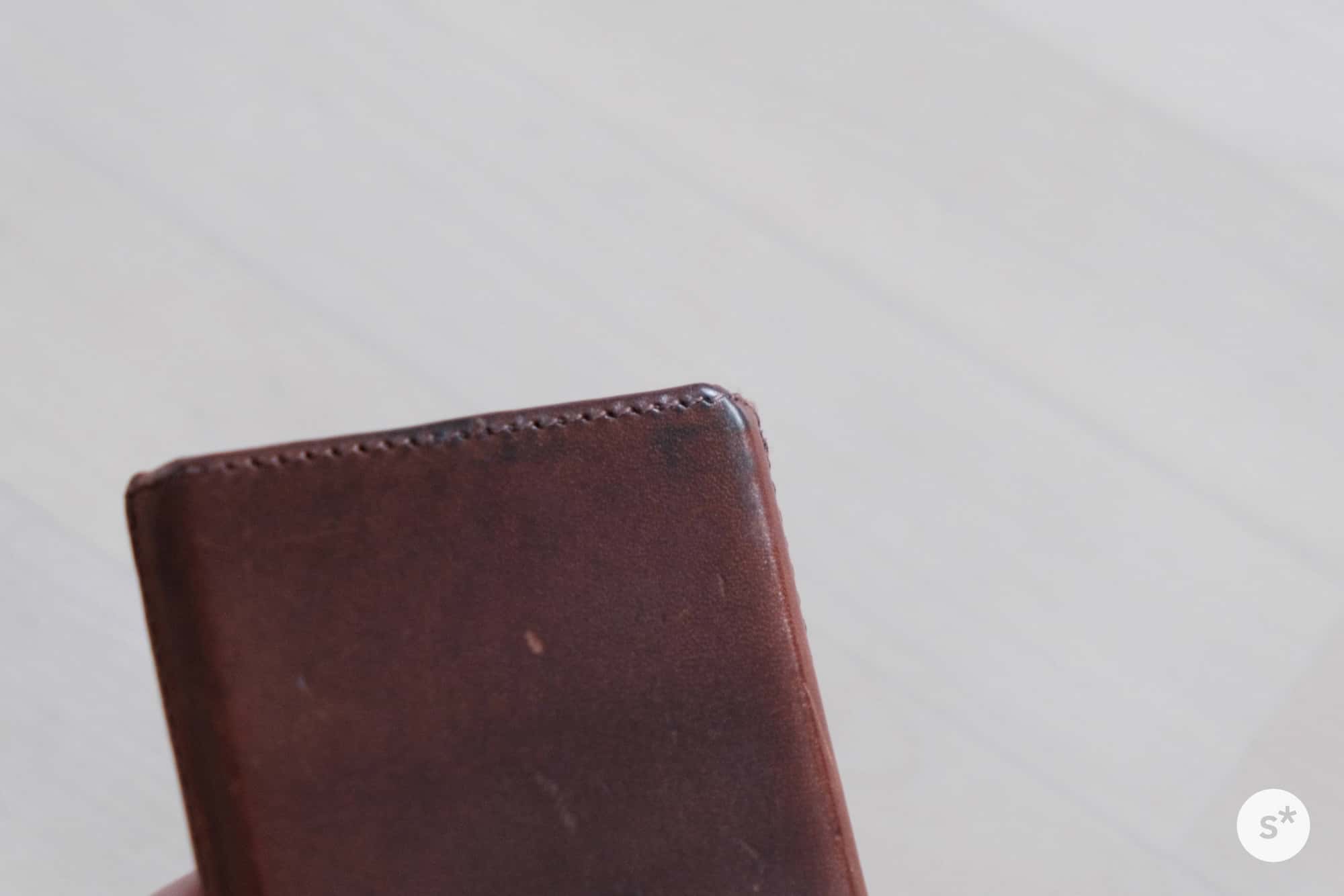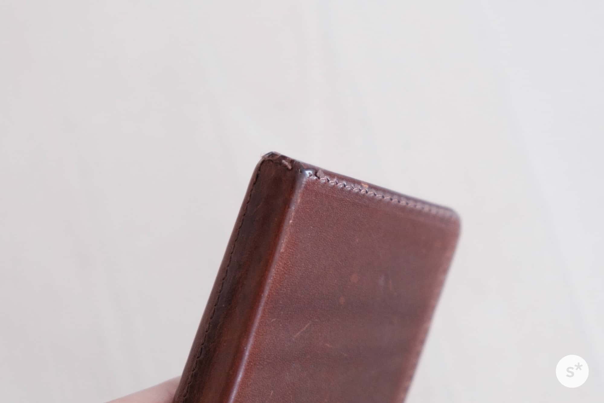 だから、この1年はPRESSoに大きく負荷がかかっていたのでしょう。エッジの部分は黒く変色した箇所もあり、さらにはステッチの糸が切れてしまっています。これはもう、経年変化の先、劣化が始まっている印です。