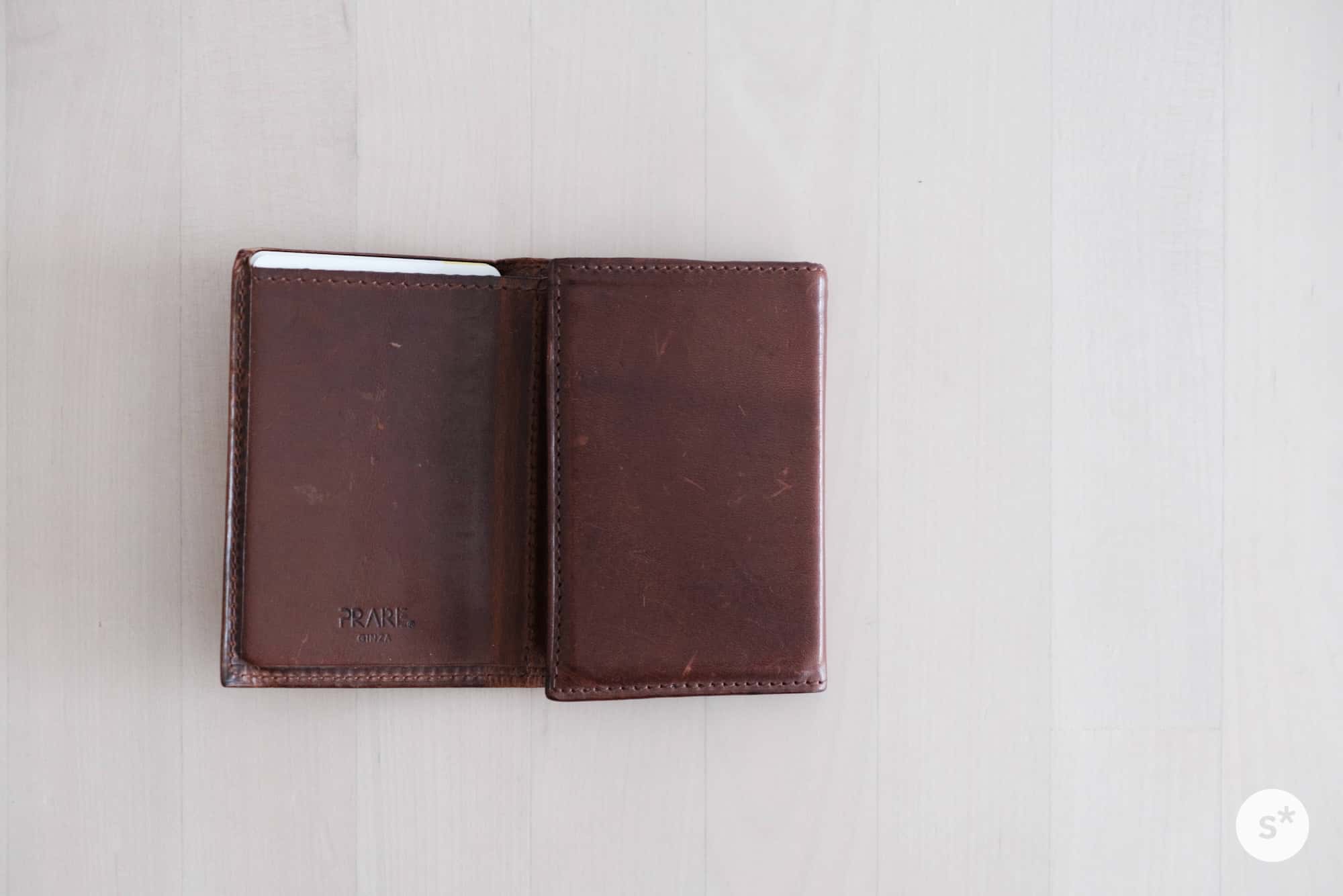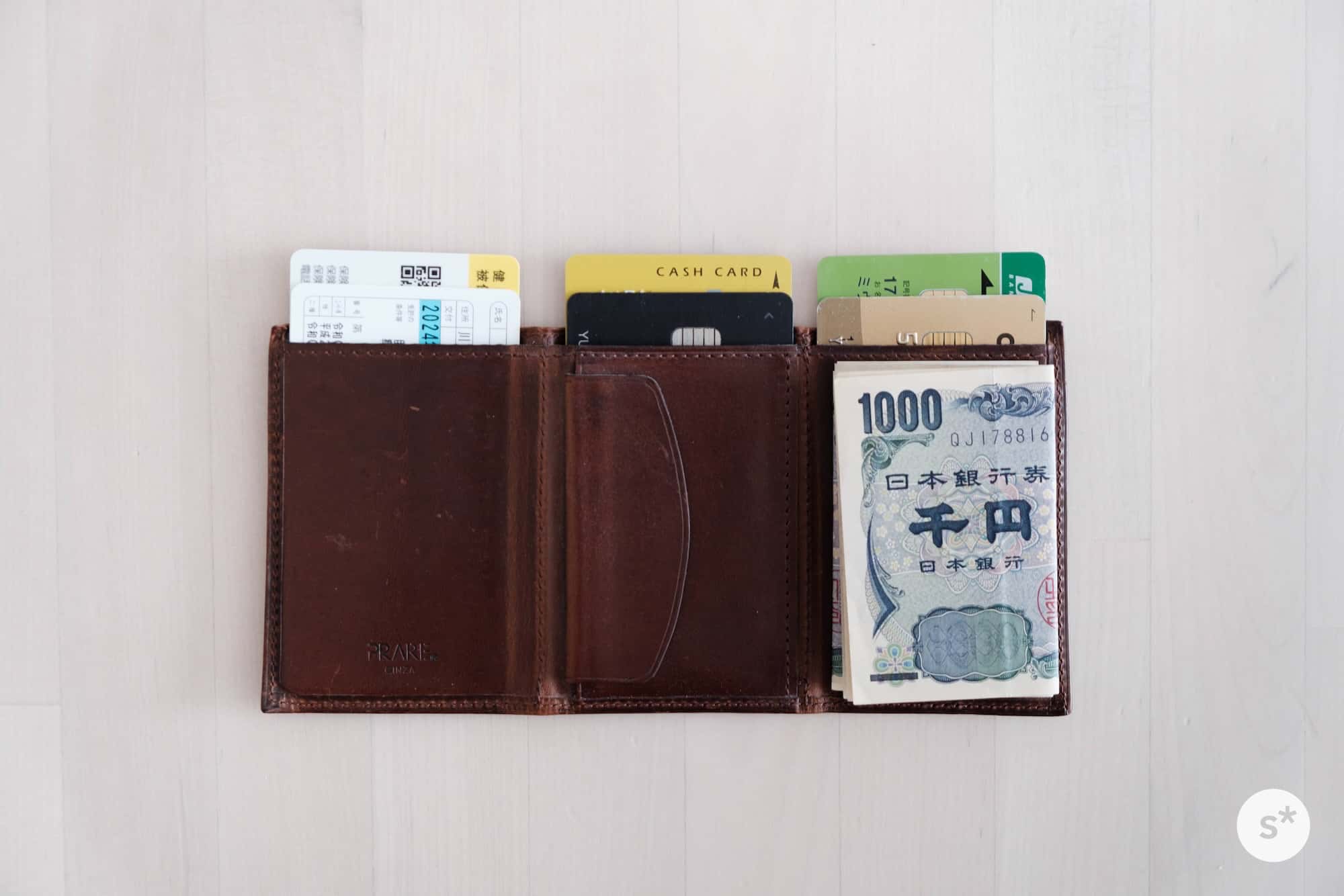 3年半も同じ財布を使っていると、さすがに使い方も固定化されます。PRESSoに入れておくのは、カード6枚と紙幣数枚。基本的に小銭入れは使わず空のままで、どうしても入れないといけない小銭があれば入れる、というような運用です。