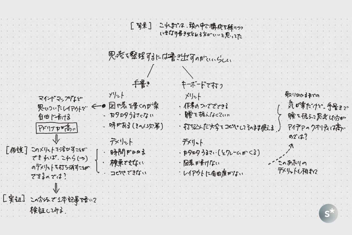 しかし、実際に手書きで整理してみたところ、実は手書きのメリットがキーボードのメリットを圧倒的に凌駕するのでは…?と思い始めました。自分の中でブレイクスルーが起きた瞬間です。
