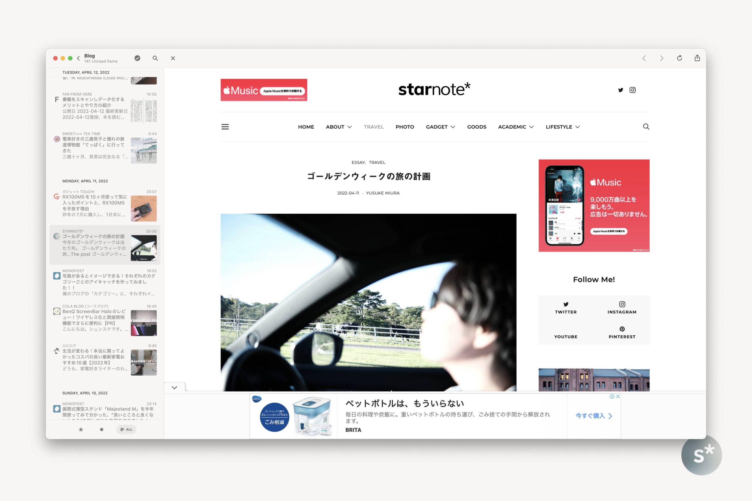もしRSSが全文配信でなくても、アプリ内にブラウザも搭載しているので安心です。ジェスチャー操作で配信されたRSSとアプリ内ブラウザの間を行ったり来たりできます。Magic Trackpadでは2本指左右スワイプ、Magic Mouseでは1本指左右スワイプです。