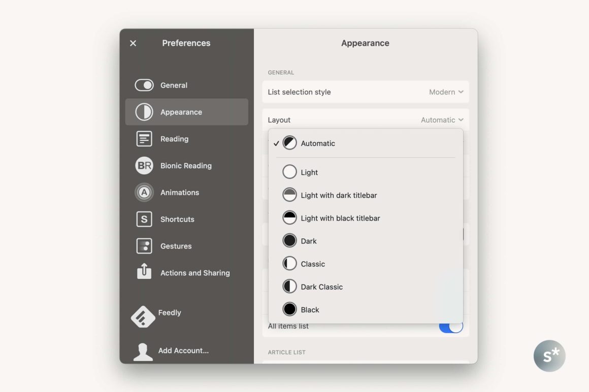 さらに、タイトルバーだけダークにすることもできるし、かつてのReederのようなクラシックモードも搭載しています。僕はクラシックモードが好きです。