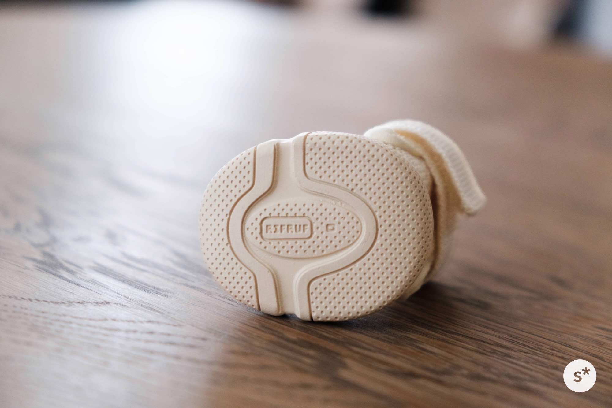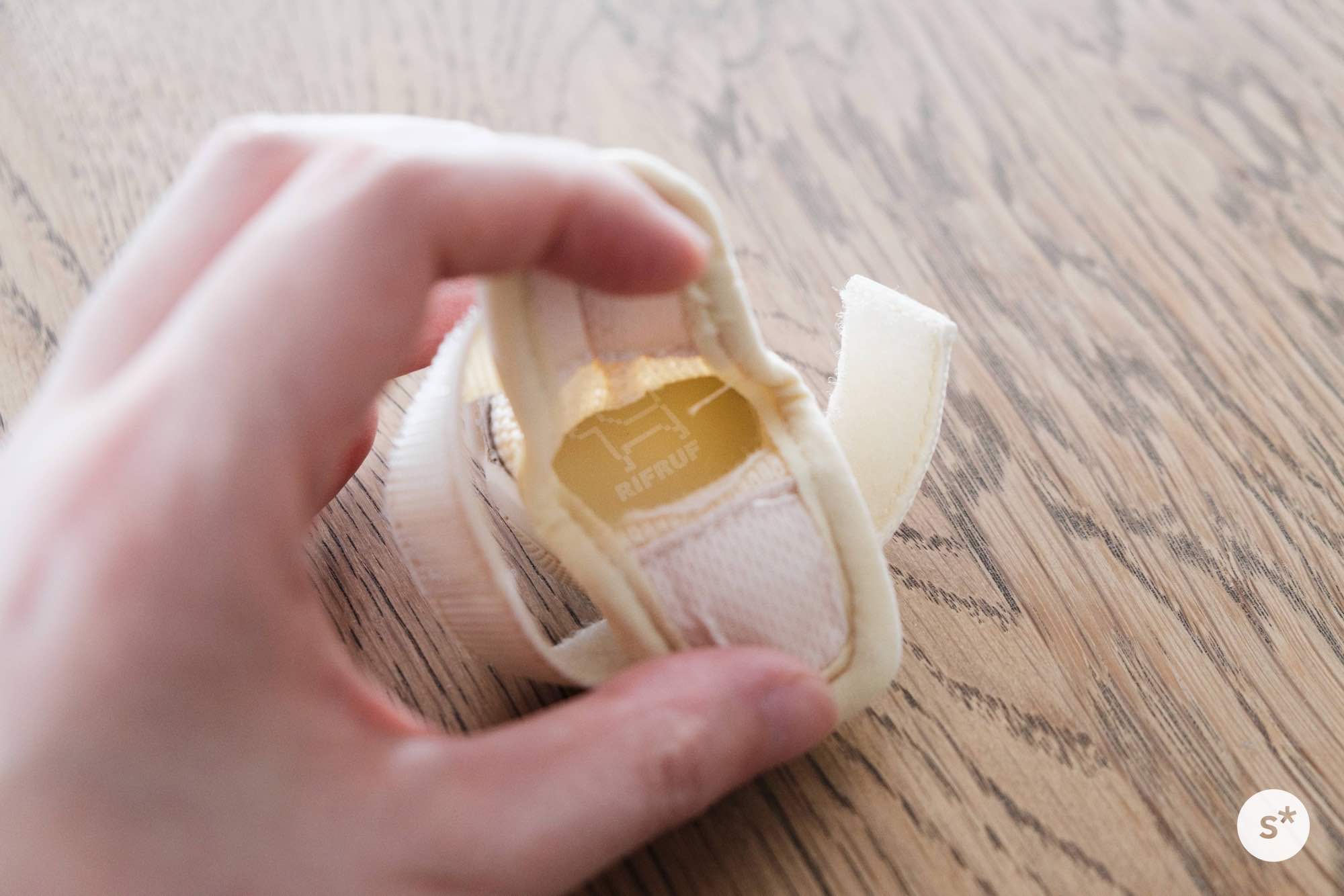 本体は蒸れないようにメッシュ素材となっていて、つま先には補強も入っています。左右それぞれにはRIFRUFロゴまで入っていて、細かい部分の縫製もとても丁寧です。このサイズで作るの大変だっただろうな。