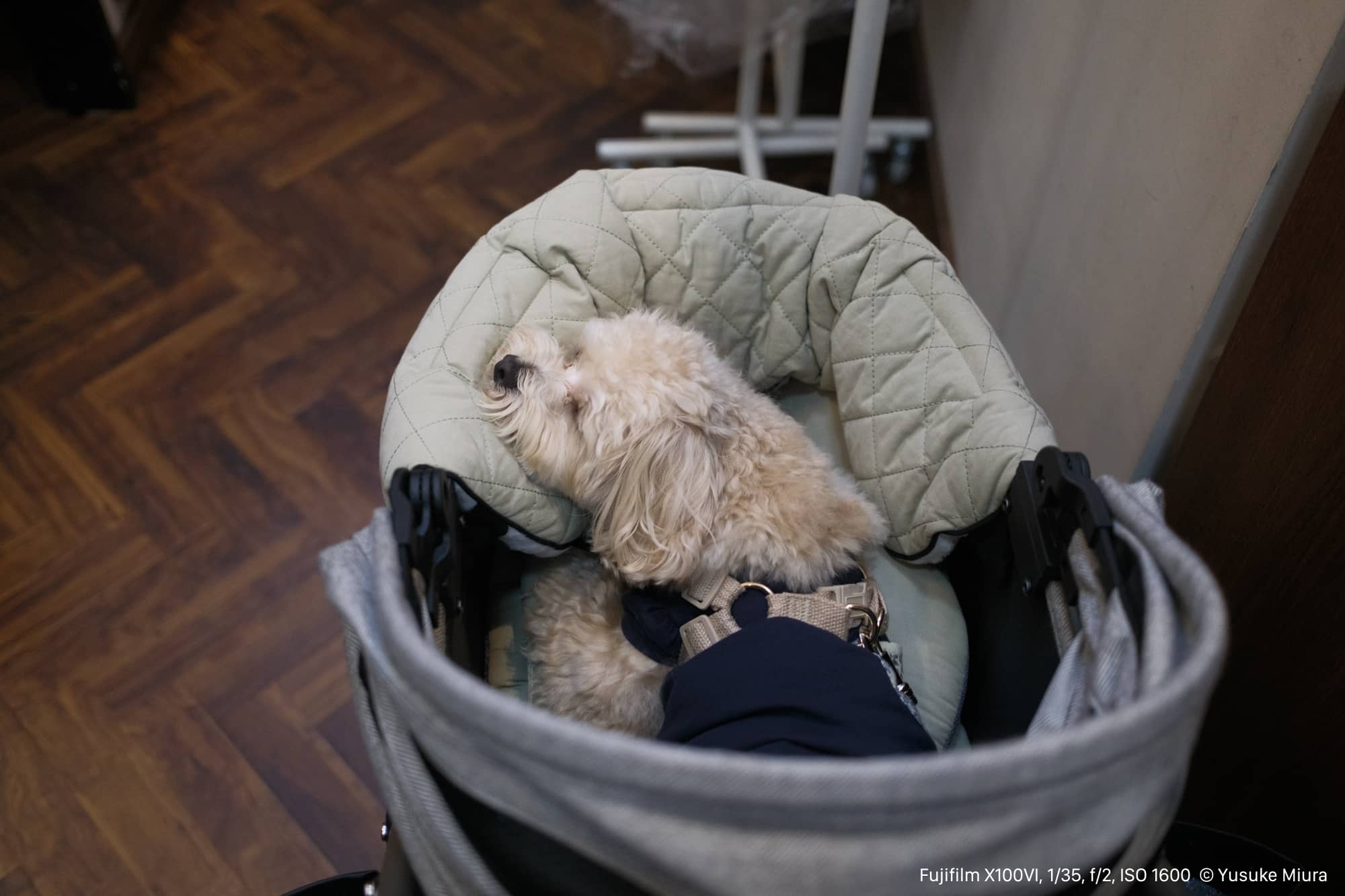 犬はもう疲れてしまったみたいで、人間の試着中はぐっすり眠っていました。朝からこんなに連れ回されたら疲れちゃうよねえ。