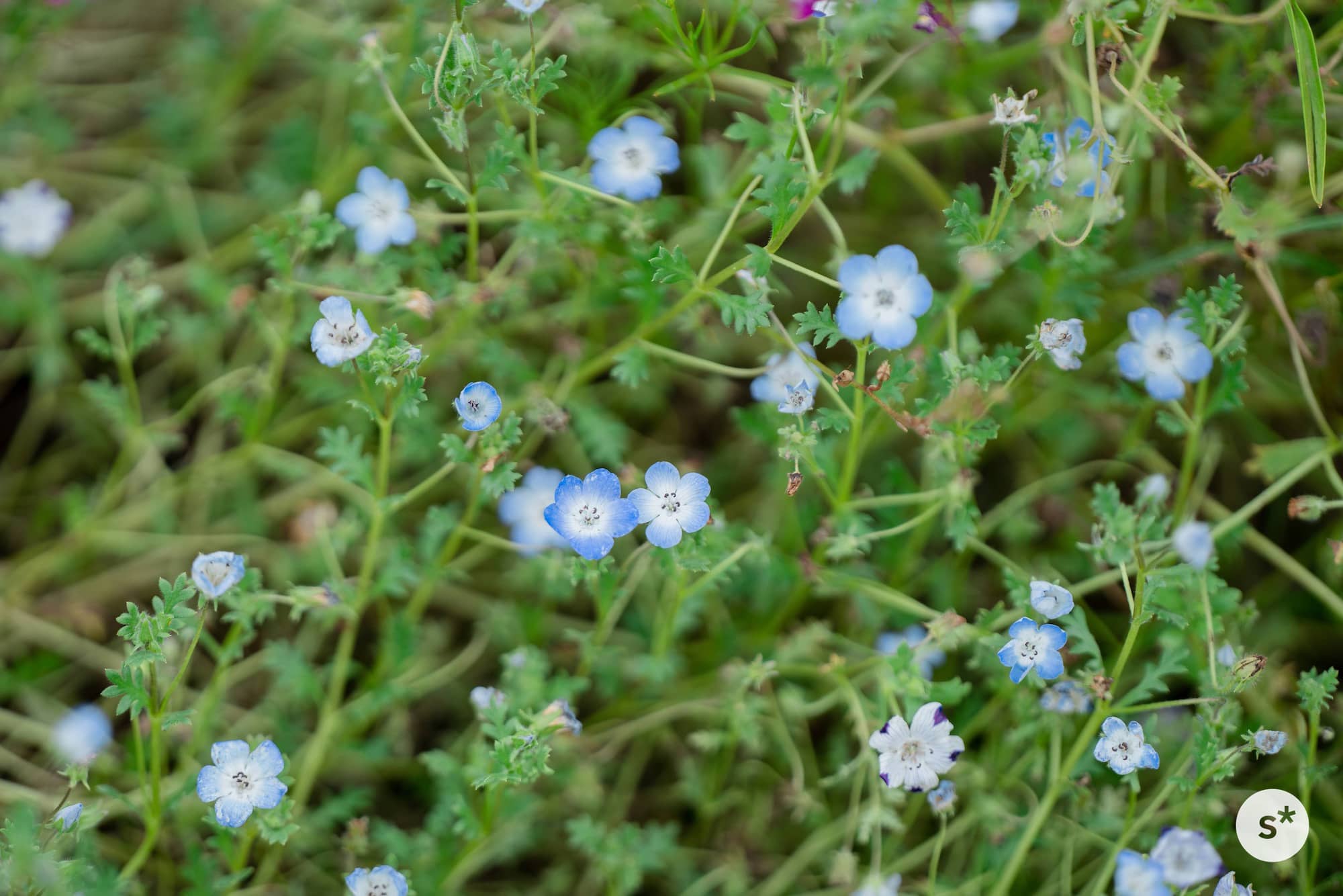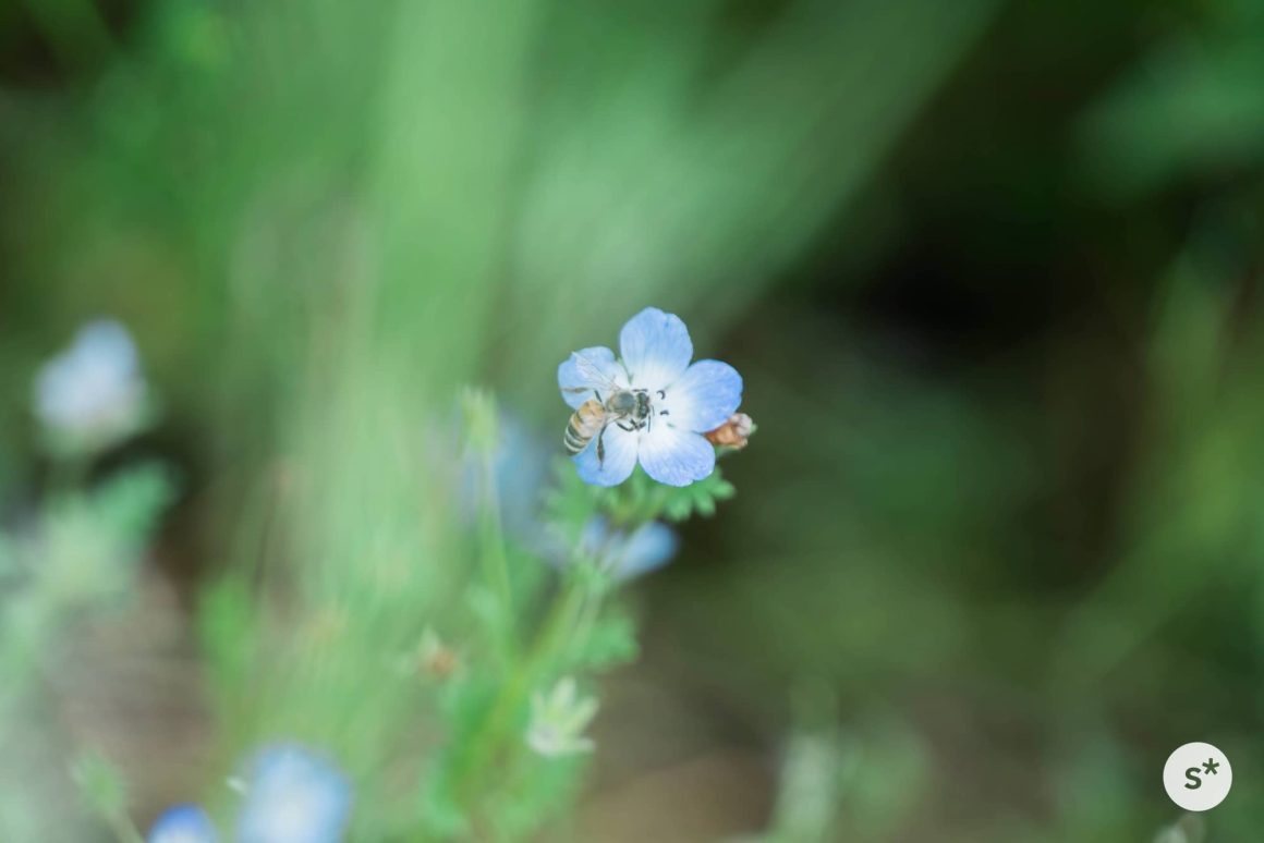 また、前ボケもきれいで、写真のクオリティを何段も底上げしてくれます。例えば、昭和記念公園のネモフィラにミツバチが止まっていた、この場面。被写体の手前には葉が重なっており、それが前ボケとなって、雰囲気のある写真になりました。