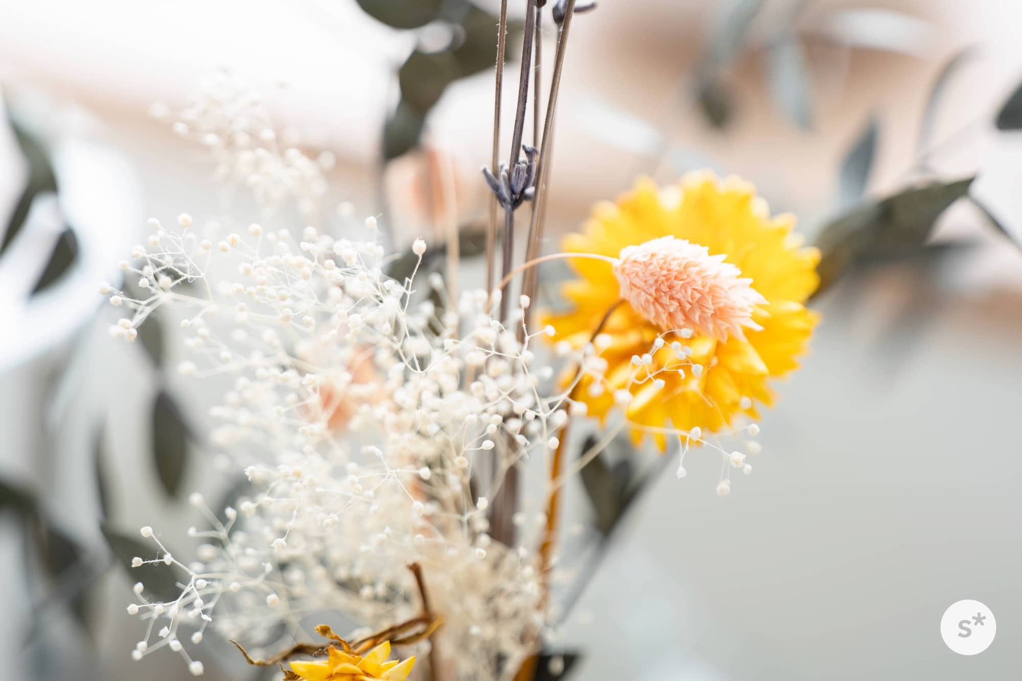 真ん中にあるドライフラワーの瓶にピントを合わせました。そうすると、手前と奥の瓶がボケて目立たなくなり、真ん中の瓶が際立ちます。写真の中の主役を明示することができるので、よりドラマチックになるんです。