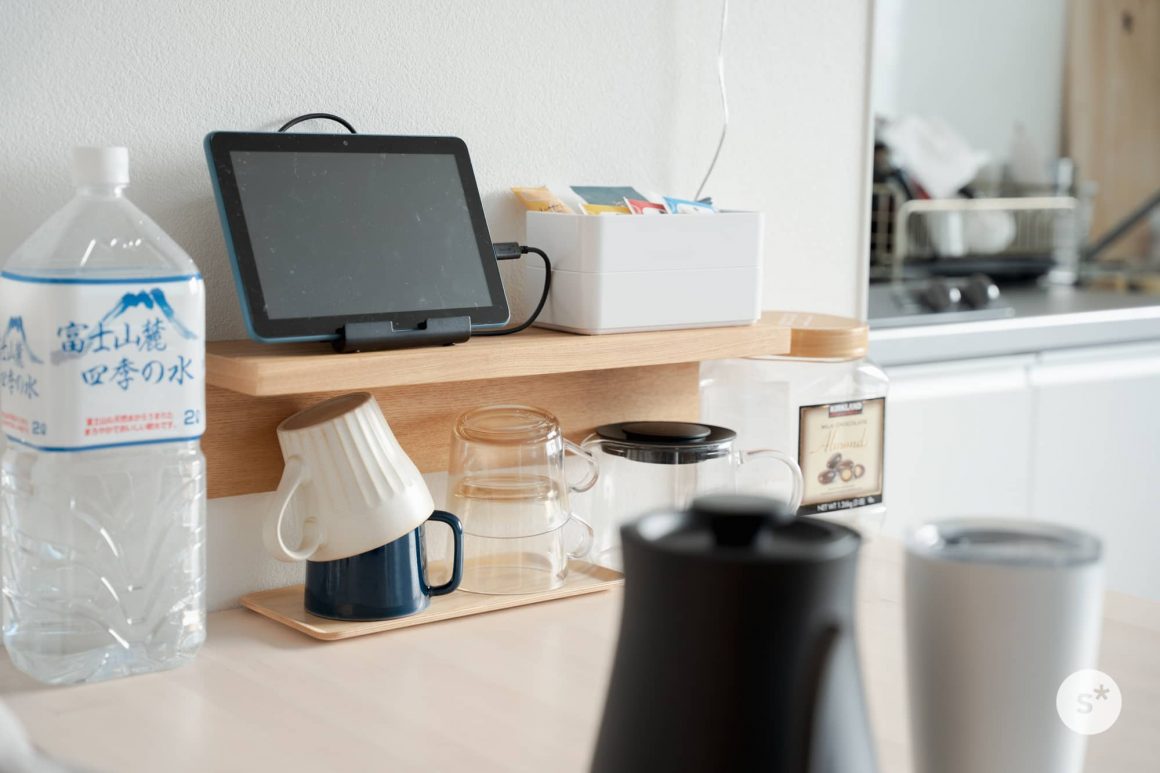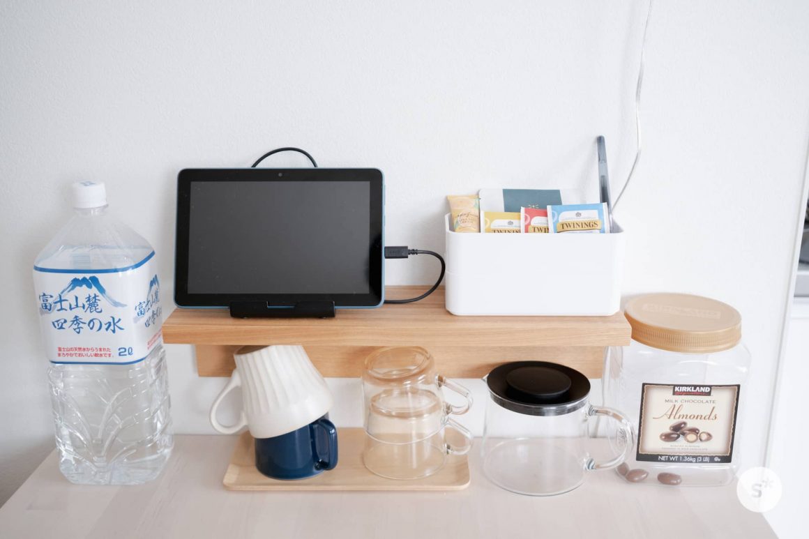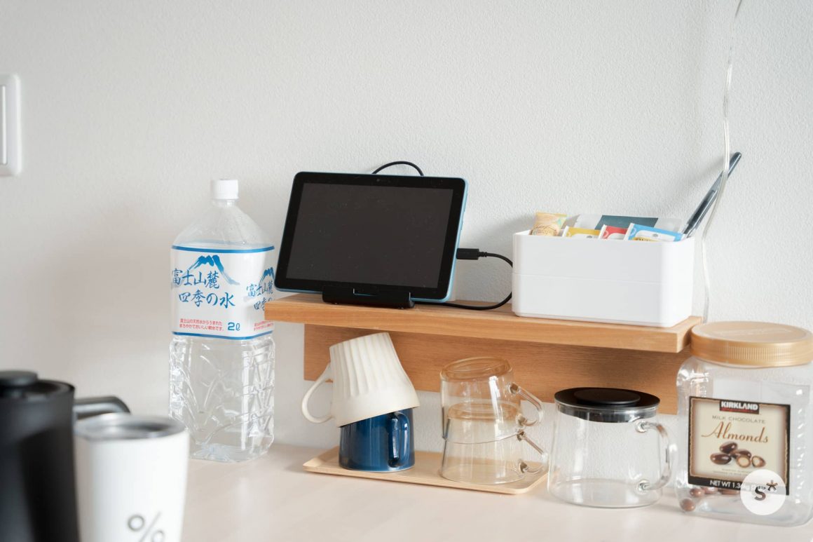 棚の上には、食事中にプライムビデオを流す用途に使っているFire HD 8と、ニトリで買ってきた小物入れを置いています。