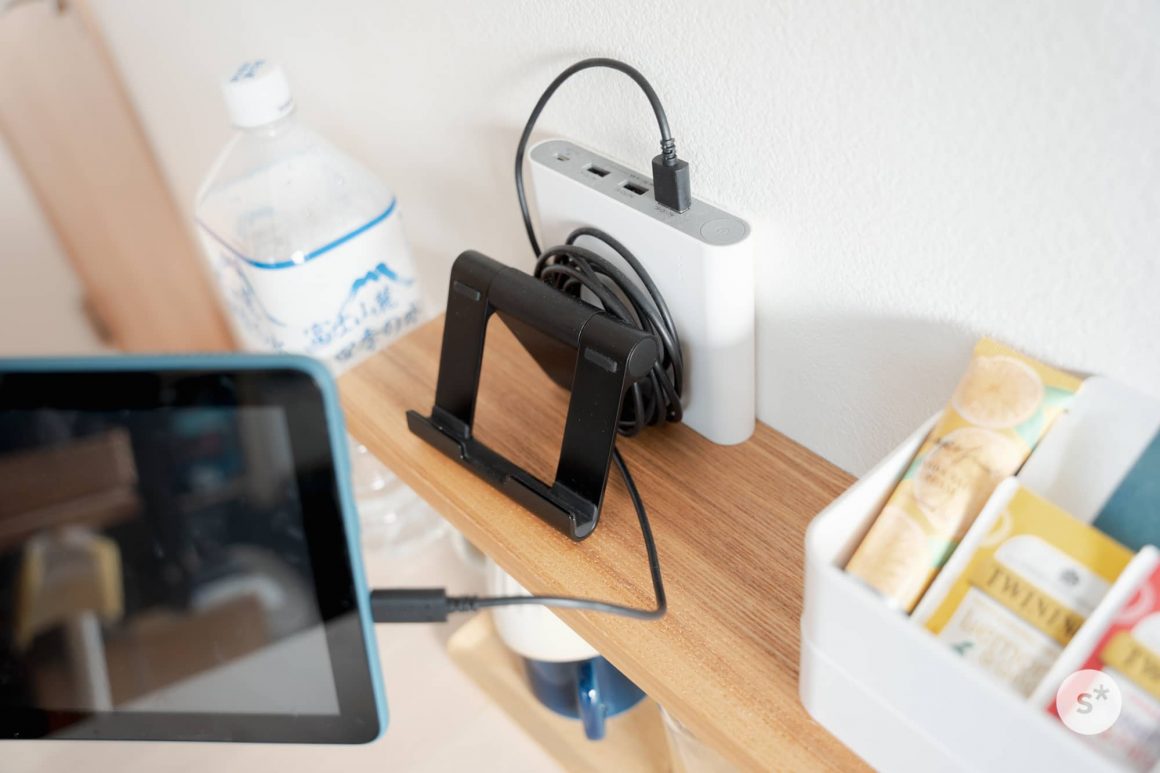 こうすることで、コンセントからFire HD 8まで電源を引く必要がなく、見た目も機能性も両立させることができました。