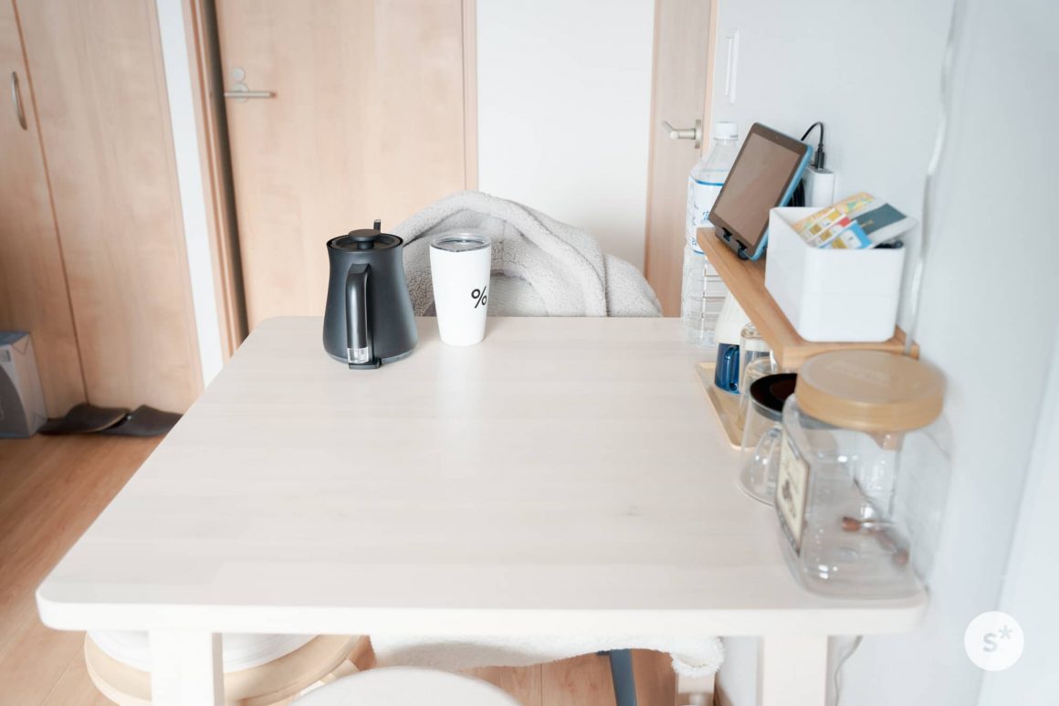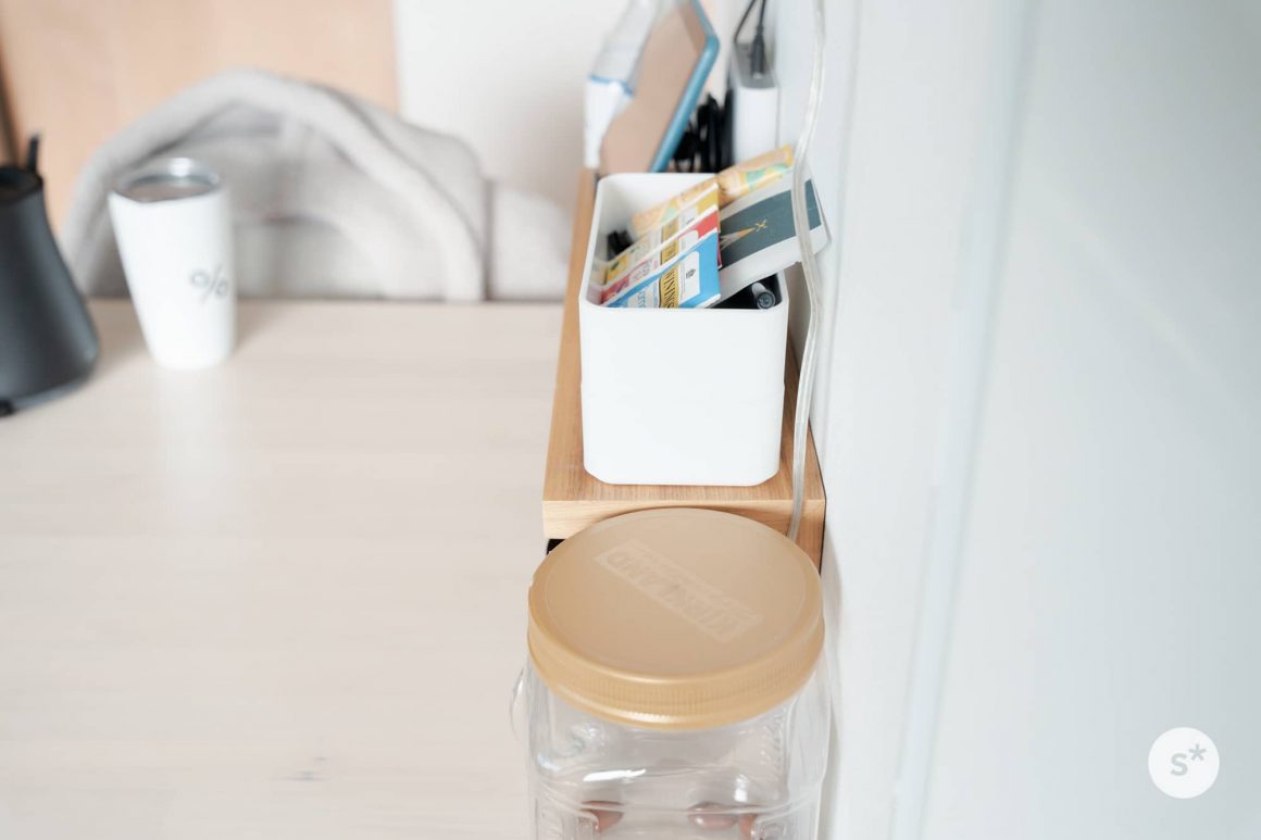 テーブルトップに乱雑に置いていたモノたちを1か所に寄せることができたので、テーブルを常に使いやすい状態に保つことができています。棚を1つ取り付けるだけで、こんなにも変わるものなのだなあ。