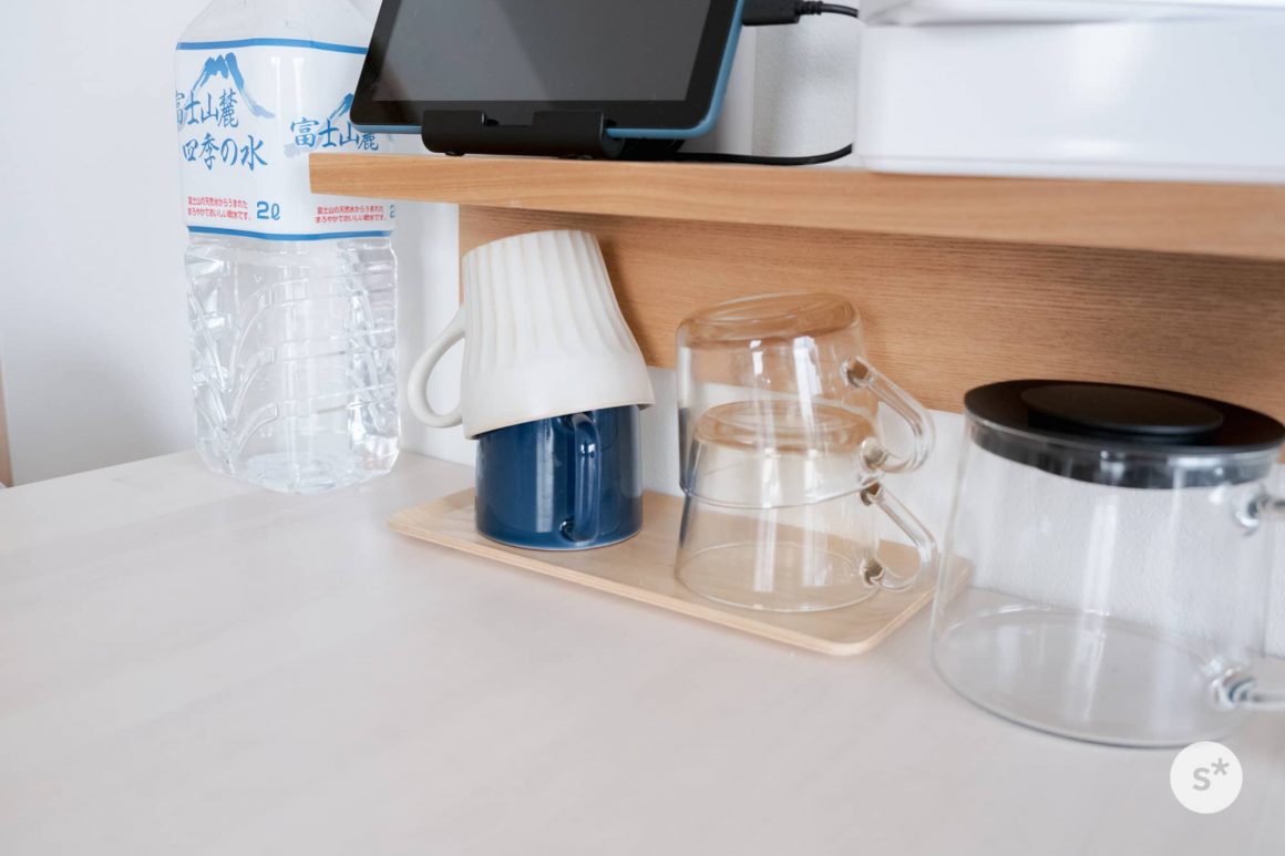 下段(というか棚の直下のテーブルトップ)には、マグカップやティーポットなど、すぐ使う食器を置きました。この食器たちの定位置はここじゃなくてもいいけれど、テーブルの上にあることに慣れてしまったので、そのままにしておきました。マグカップはIKEAの「ORDNAD」というトレー(12x25cm)に乗せています。