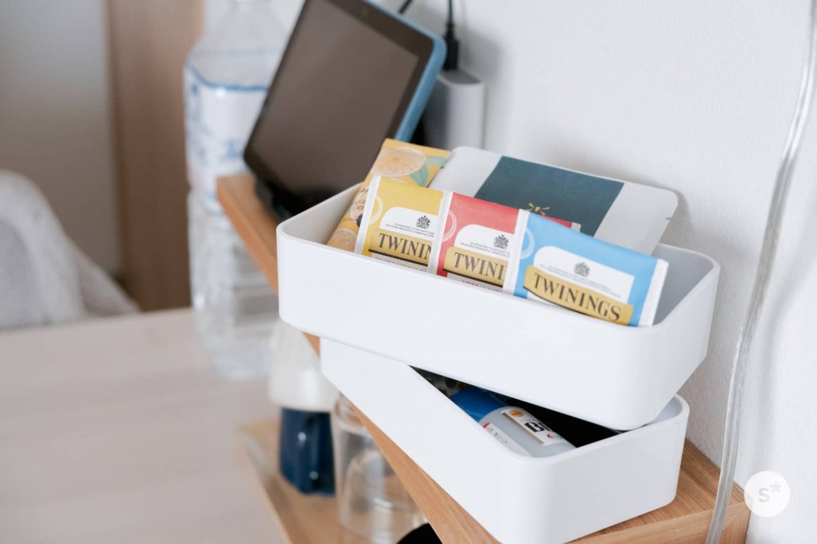 また、その隣にはニトリで買ってきた「整理トレー Nブラン Mサイズ」を2段重ねています。上段にはティーバッグやハンドクリームなどの小物を、下段にはよく使う薬などを入れています。シンプルな見た目で1つ149円(税込)という、おすすめのトレーです。