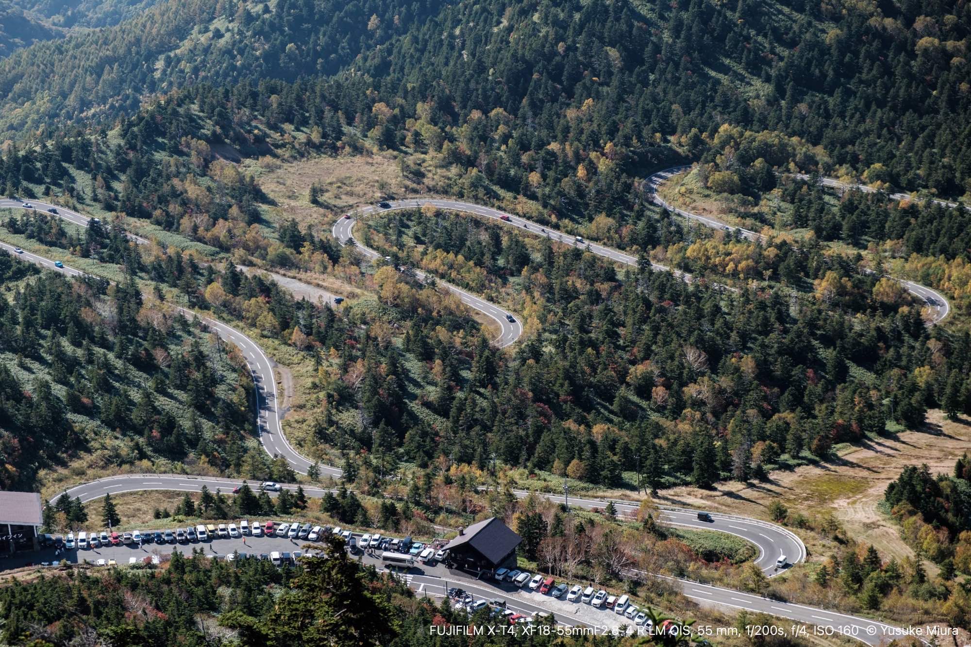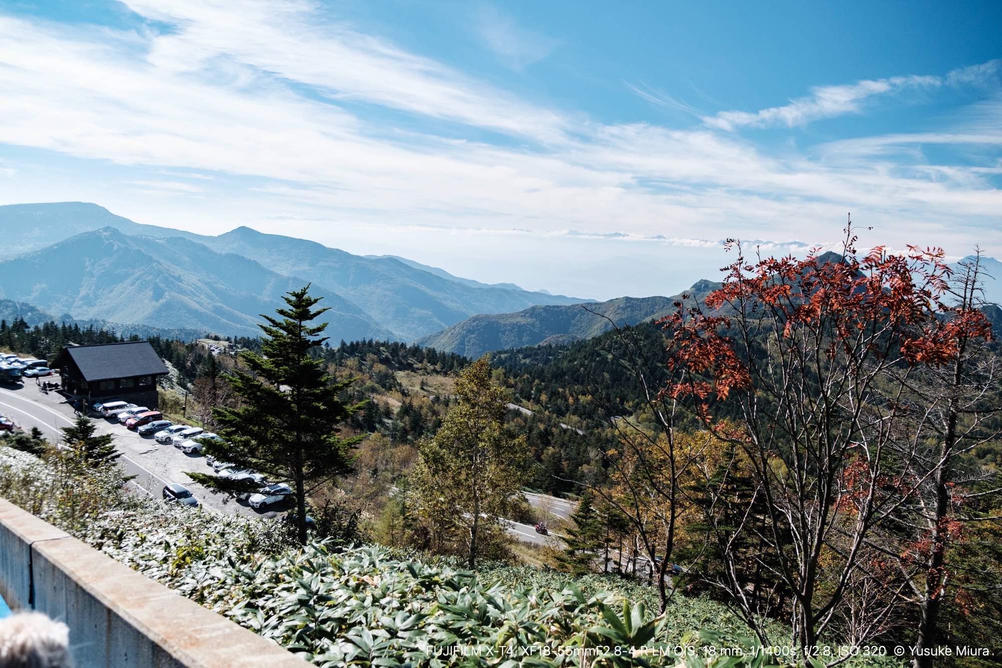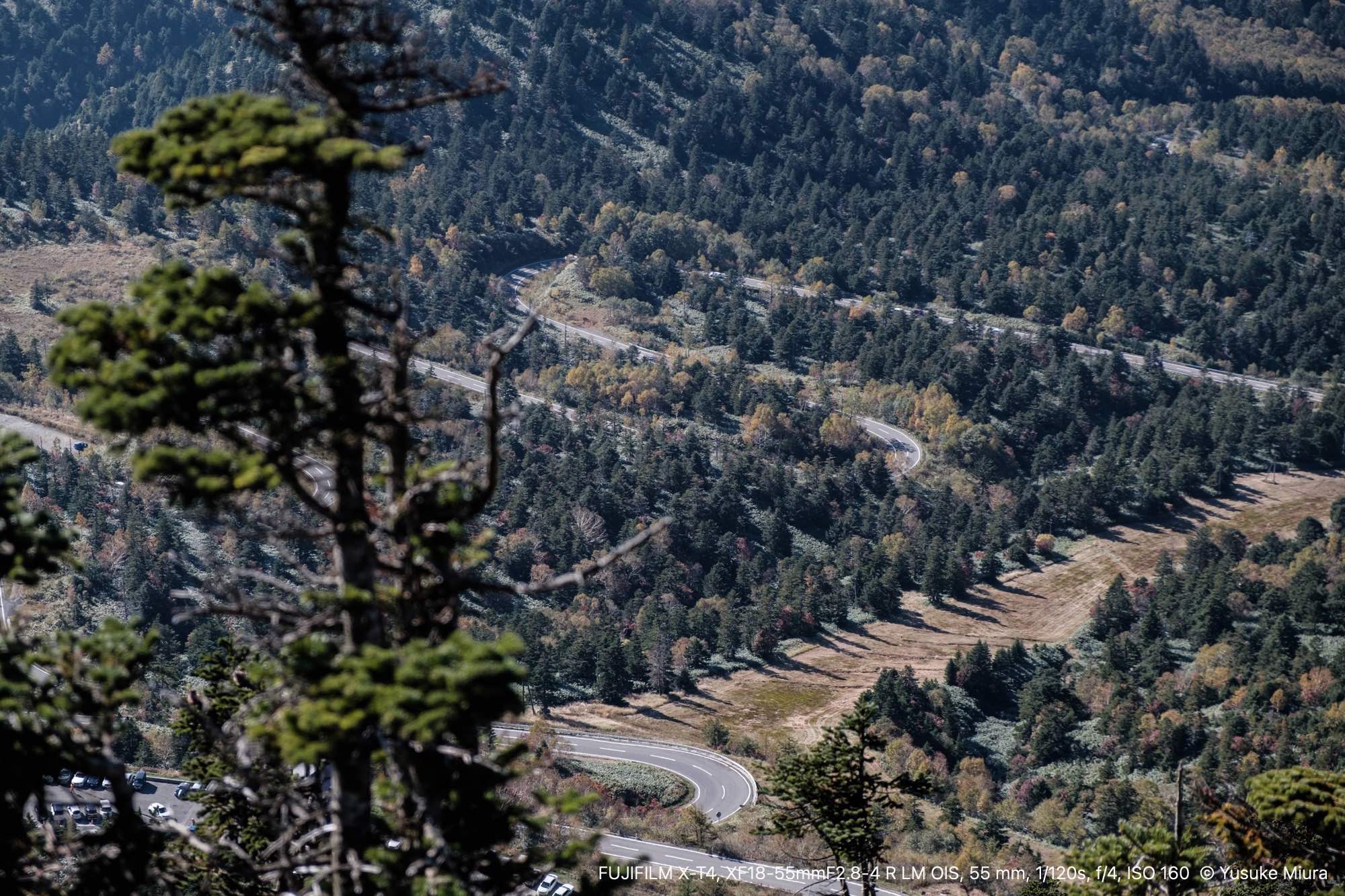これから進んでいく草津側の風景。写真中央あたりを走っている道路が国道292号で、このあたりに国道標高最高地点(2,172m)があります。このエリアは11月中旬から冬季閉鎖に入るので、走りたい人はお早めに。