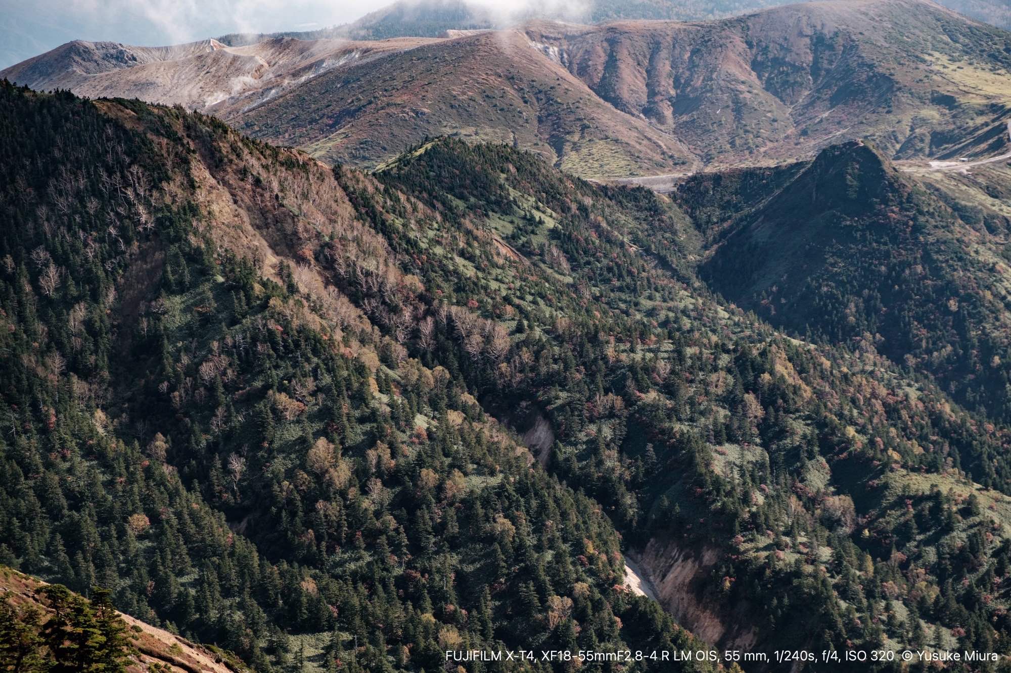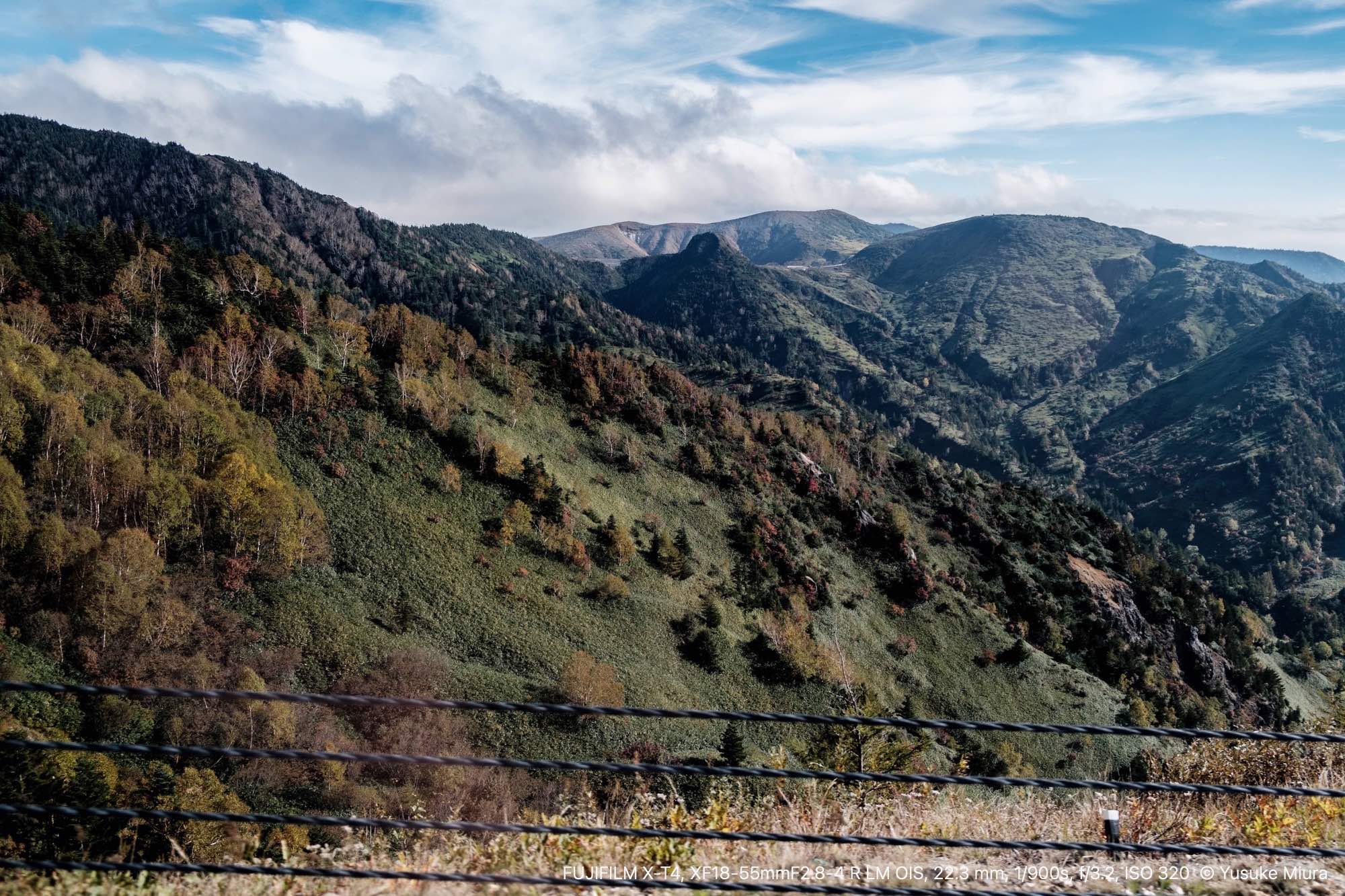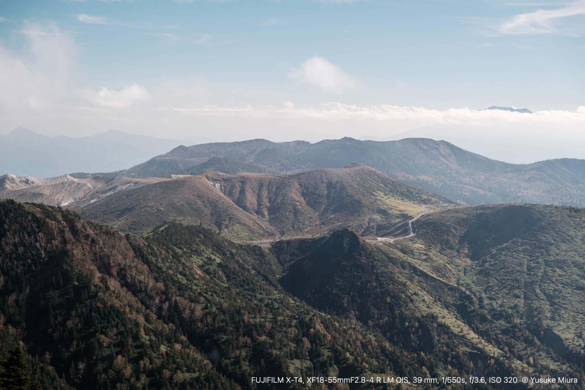 これから進んでいく草津側の風景。写真中央あたりを走っている道路が国道292号で、このあたりに国道標高最高地点(2,172m)があります。このエリアは11月中旬から冬季閉鎖に入るので、走りたい人はお早めに。