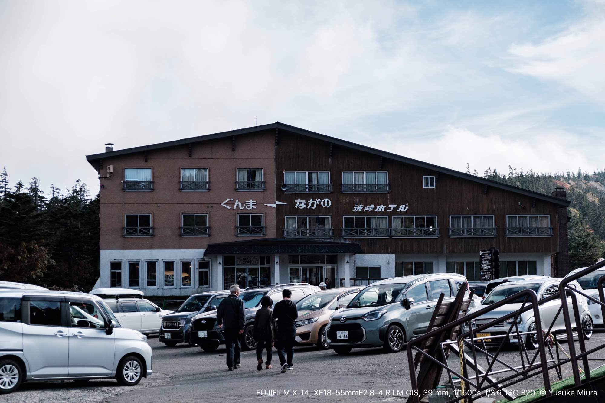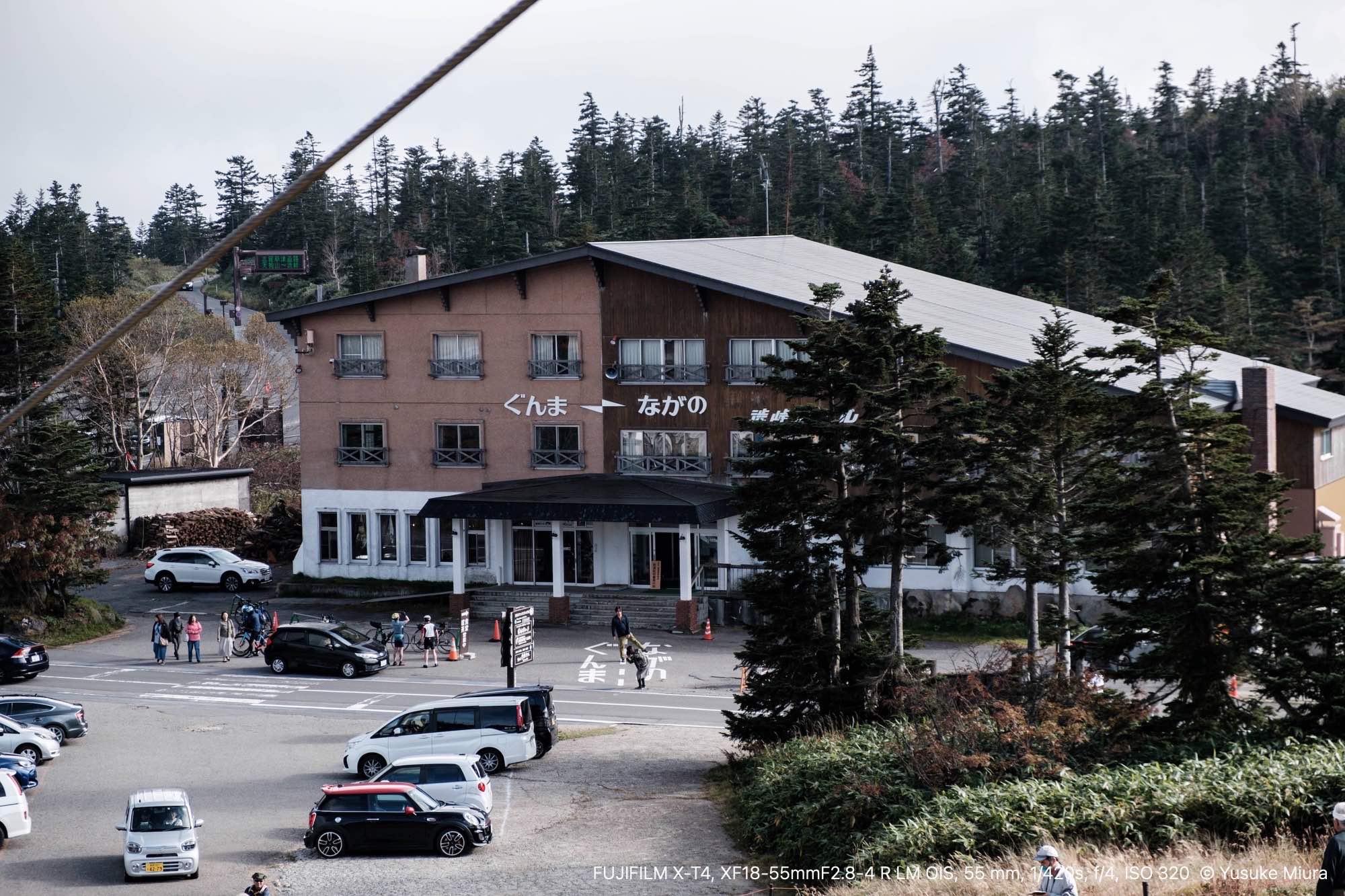 県境に立っていることで有名な渋峠ホテルが見えてきました。山頂は長野県でしたが、渋峠ロマンスリフトの乗り場あたりから群馬県に入っていました。なのでこの写真は群馬県側から県境を眺めています。