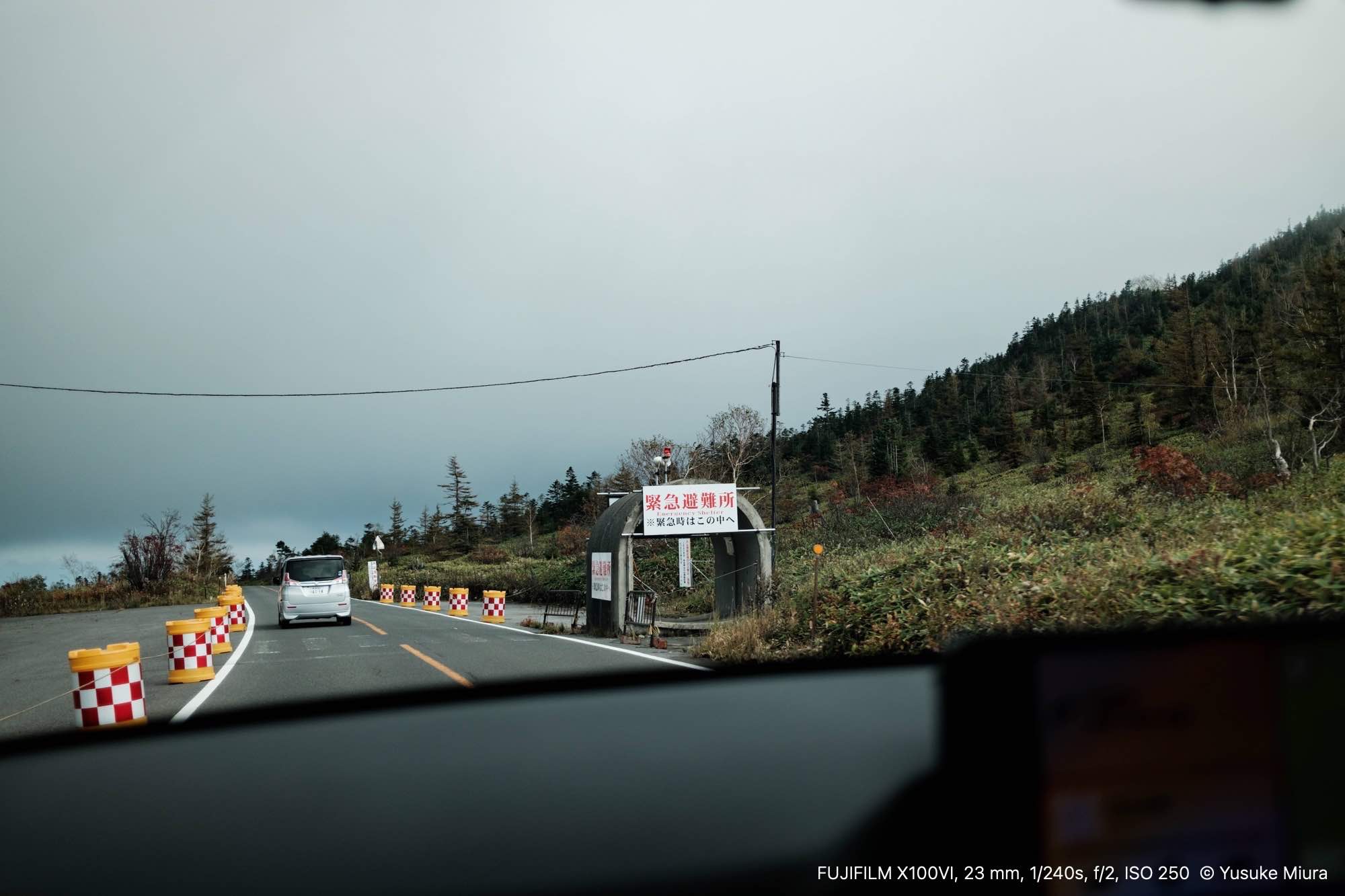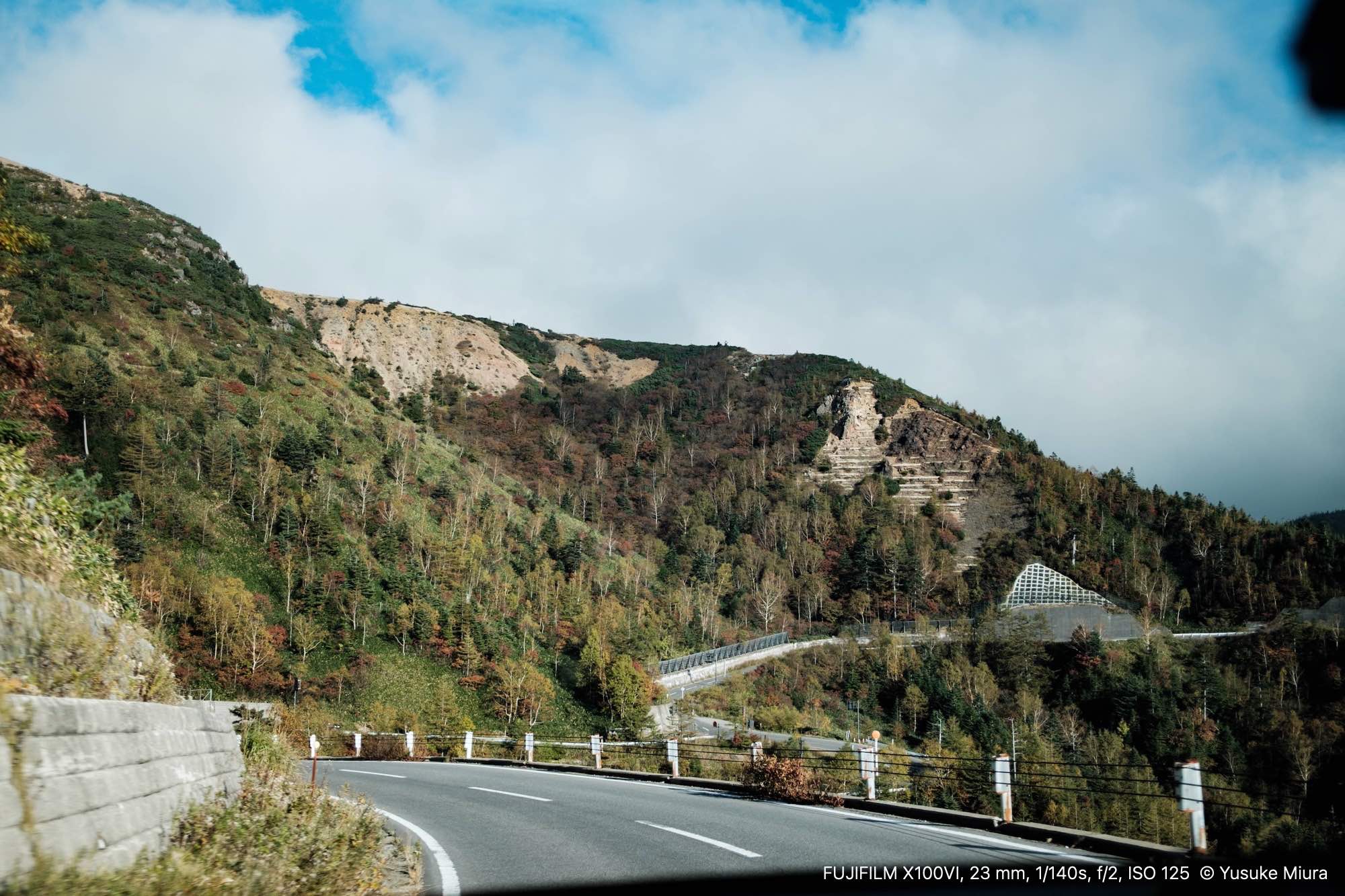 活火山である白根山に近づくと道端に緊急避難所があったりして、なかなか物騒な雰囲気が漂っています。そのうえ、急斜面に佇む紅葉や、断崖絶壁に道がへばりついている様子など、このあたりも日常離れした風景が広がっています。ほんと、国道292号は魅力的な場所が多い。
