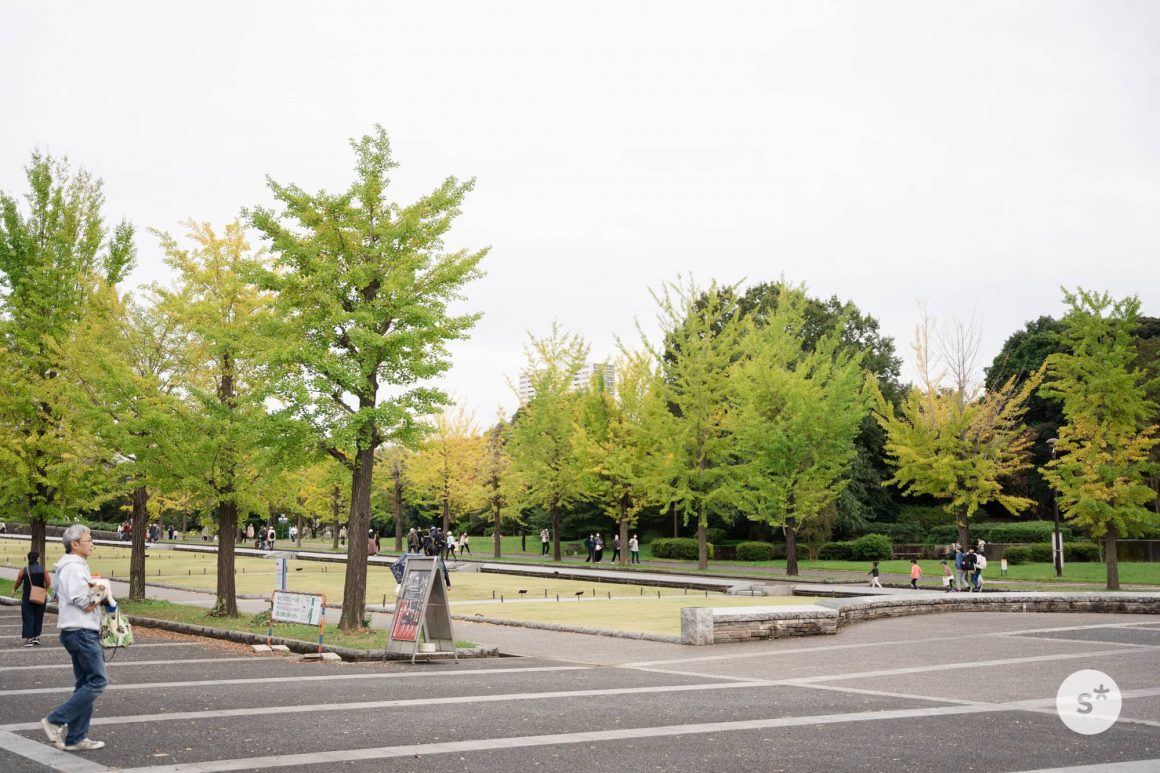 秋になると「真っ黄色」になるイチョウ並木も、このときはまだ、ほとんどが緑色でした。一部黄色くなりかけている木もあり、秋の始まりを感じさせるような光景が広がっています。早く全部黄色くならないかなぁ。