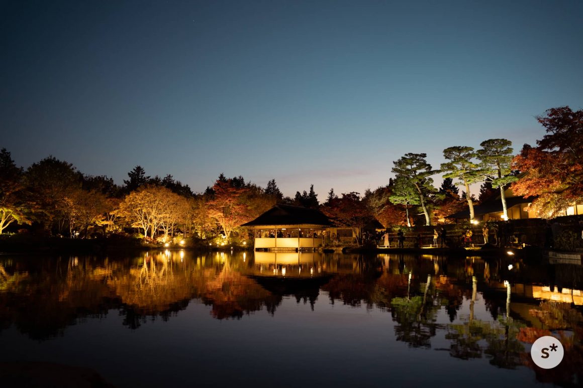 そして、目玉である池の畔へ。東屋ともみじが、マジックアワーの空を背景に彩られていた。今日は風が弱いから池が波立たず、綺麗に写っているのだそうだ。