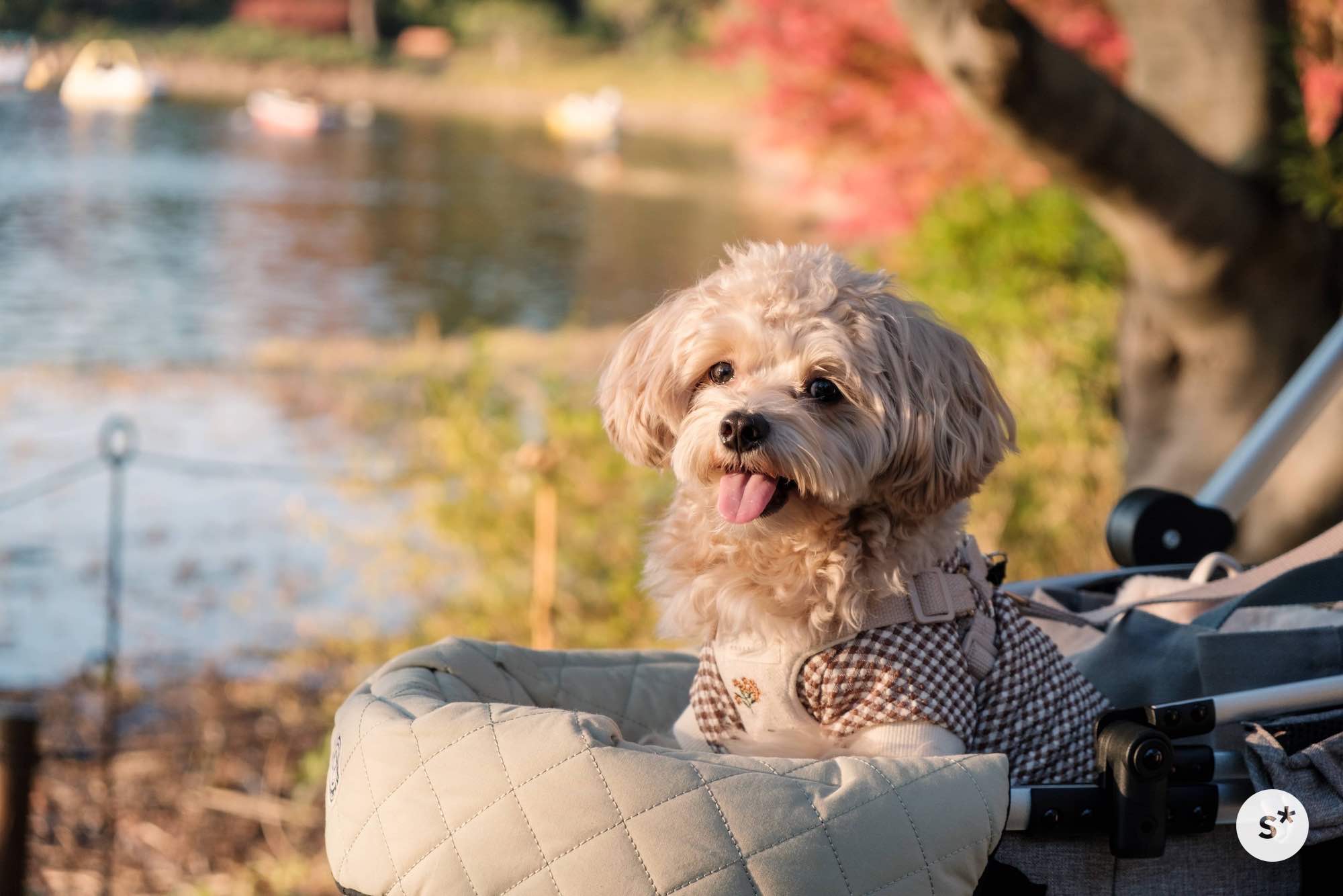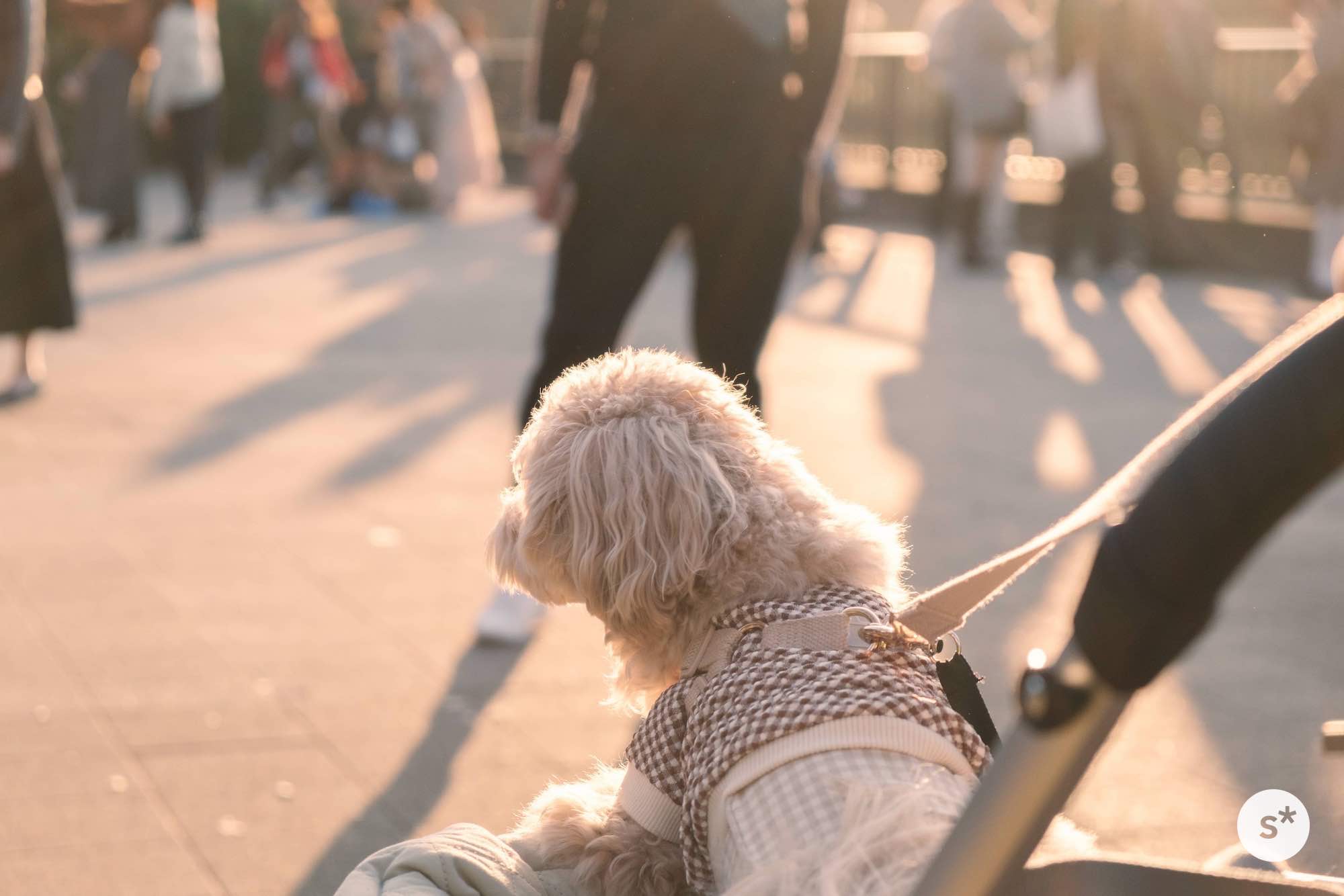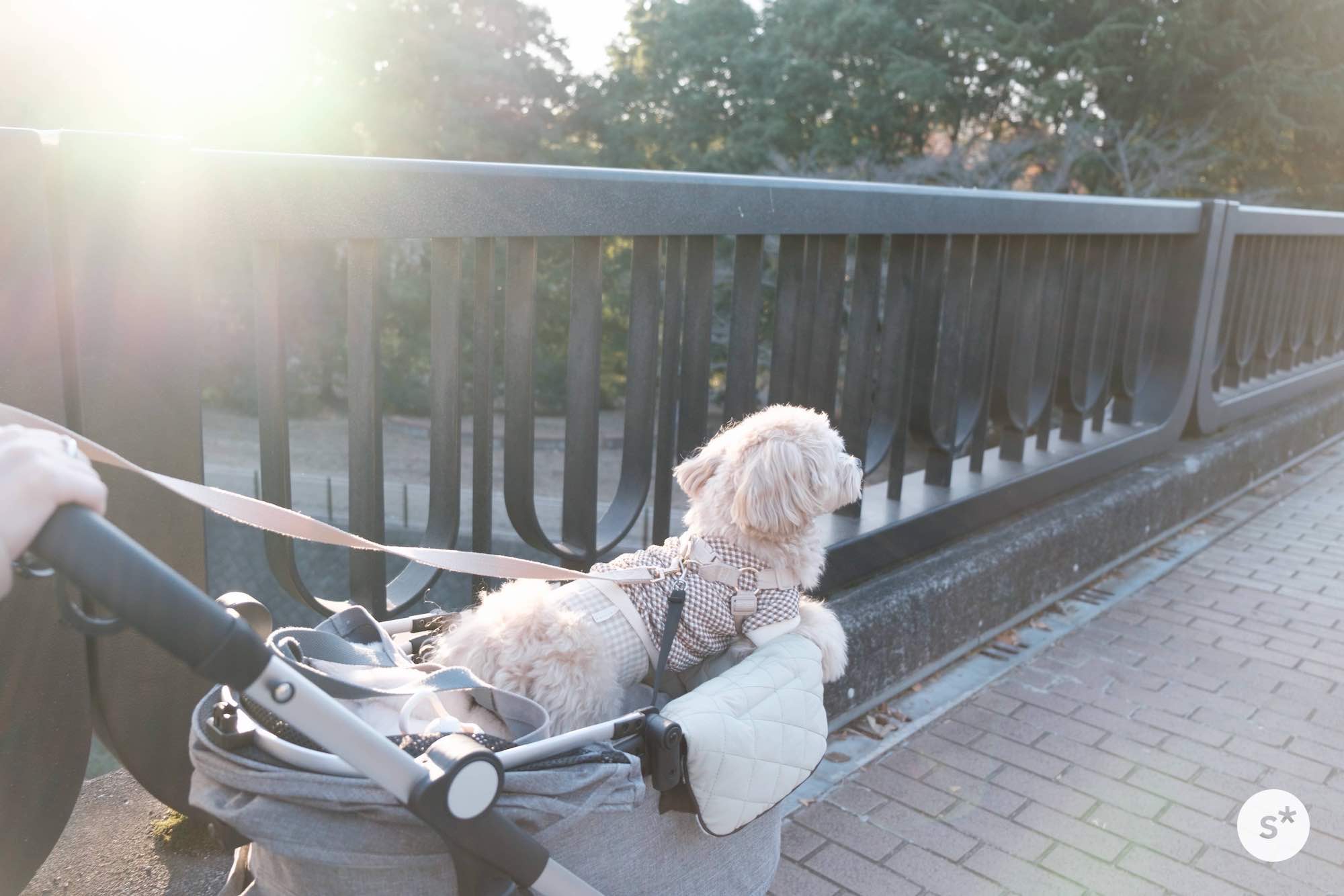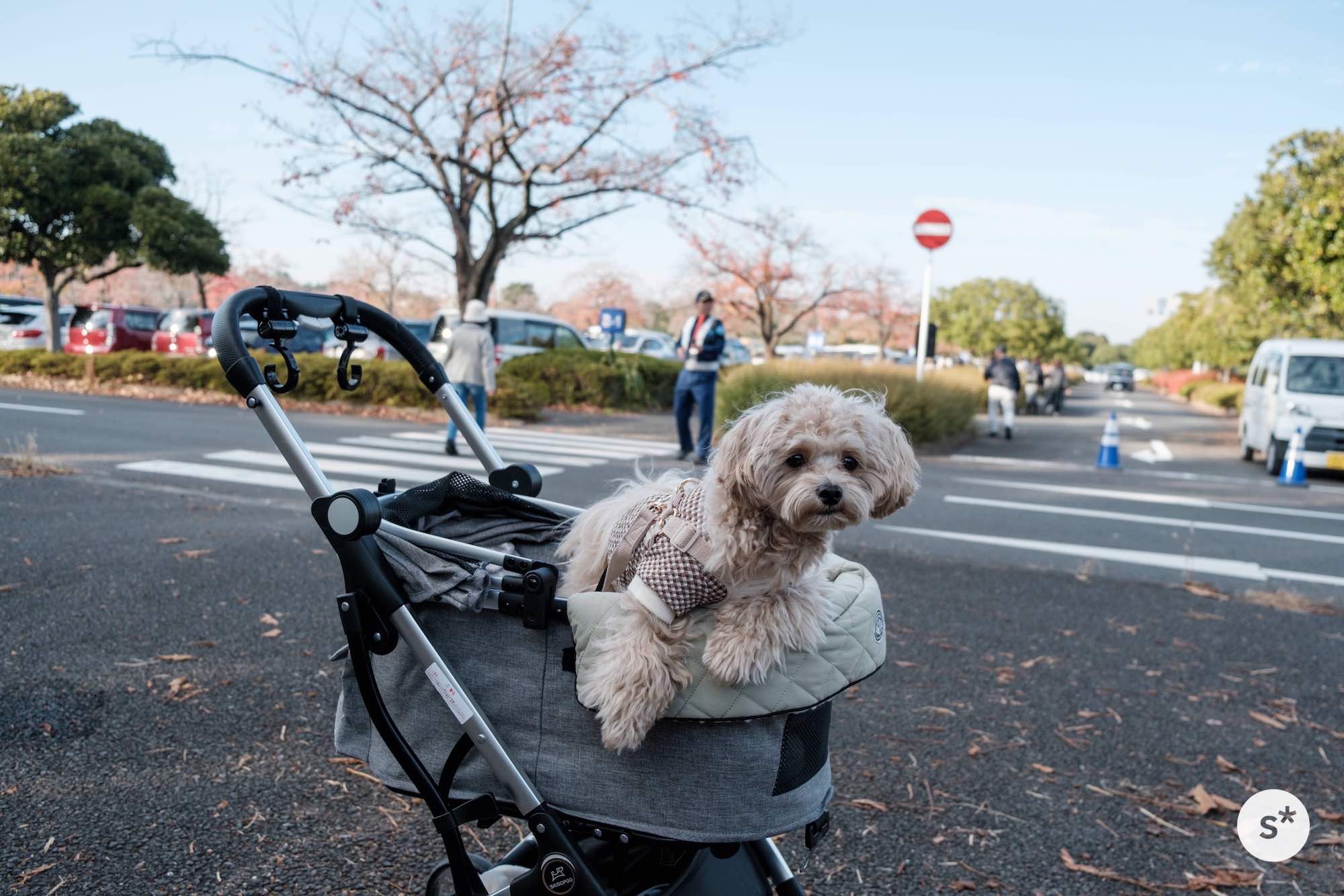 人混みの中でリードを引くのは大変だし、誤って踏まれる危険性もあるので、今回はカートに乗ってもらうことにしました。これだと安心だね。