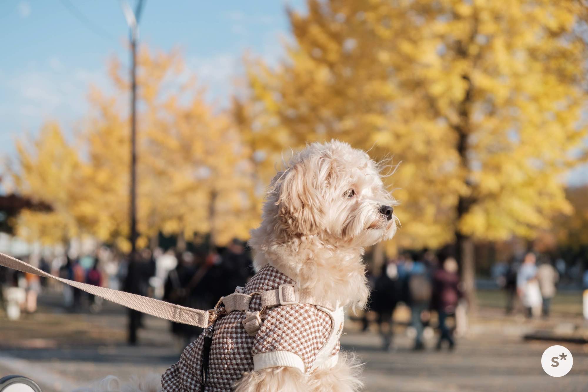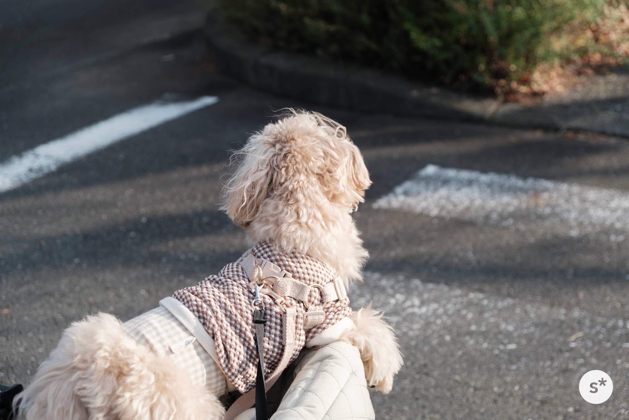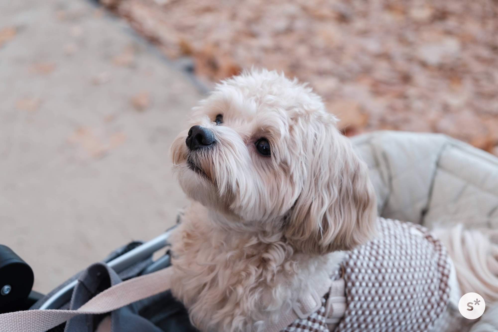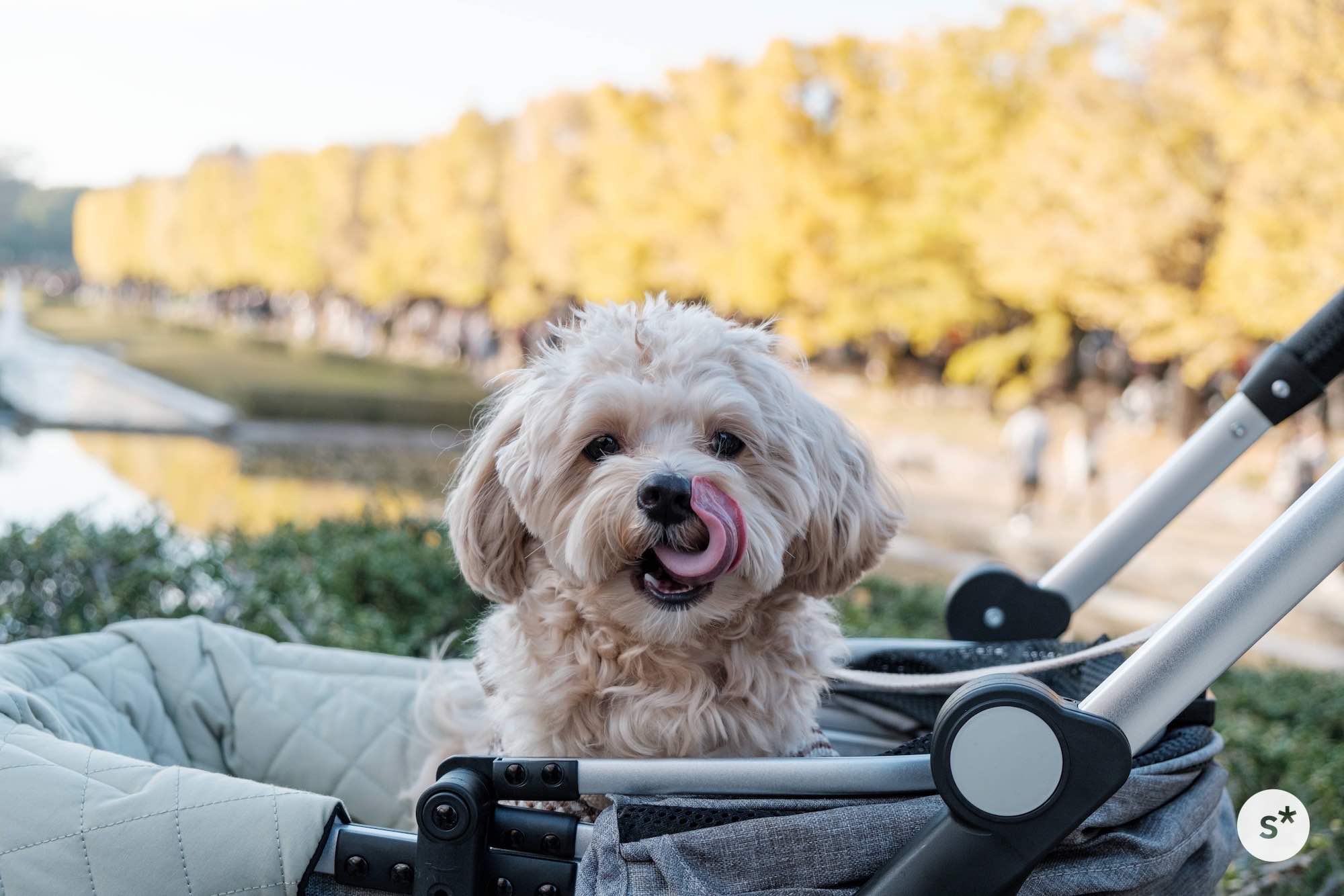人混みの中でリードを引くのは大変だし、誤って踏まれる危険性もあるので、今回はカートに乗ってもらうことにしました。これだと安心だね。