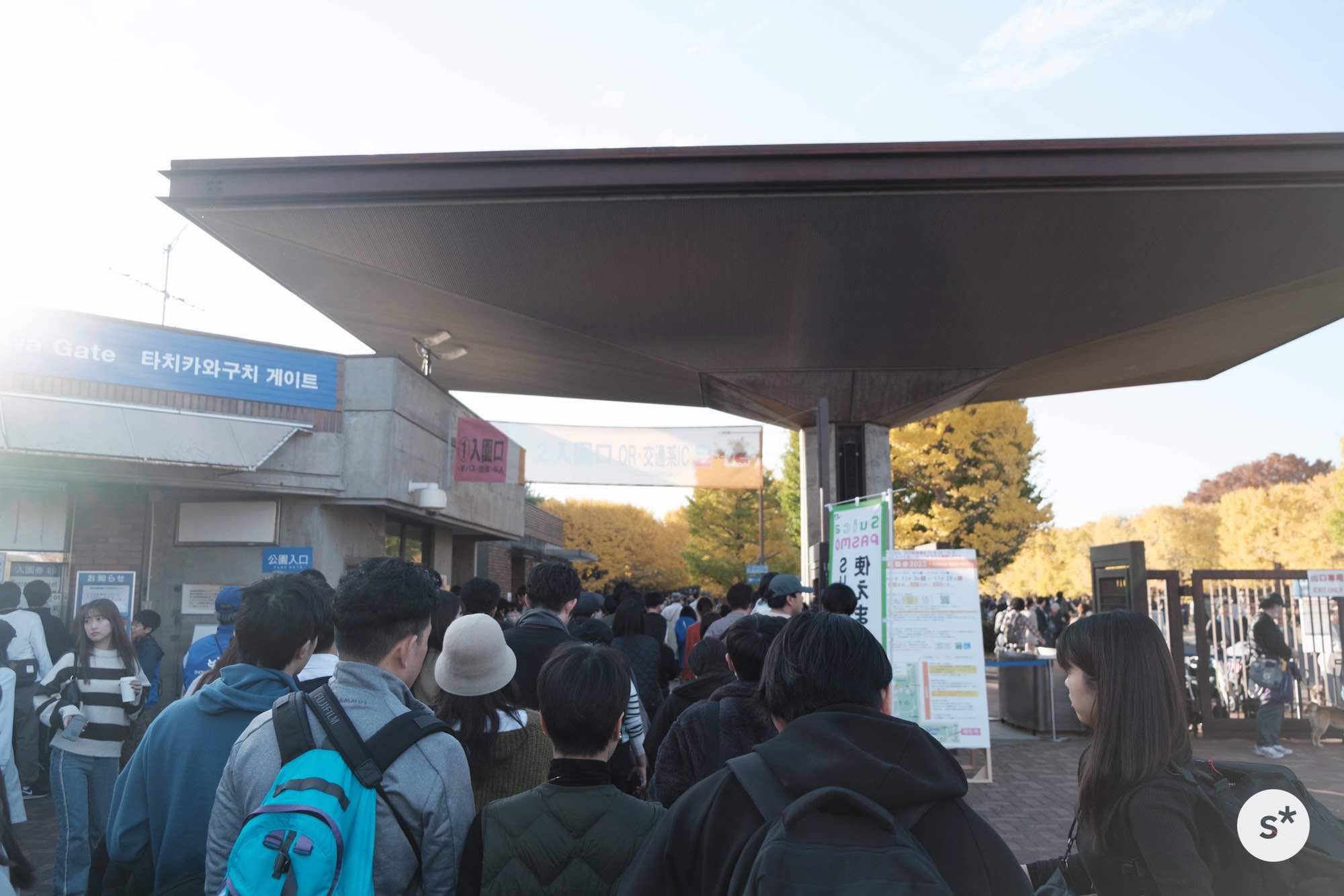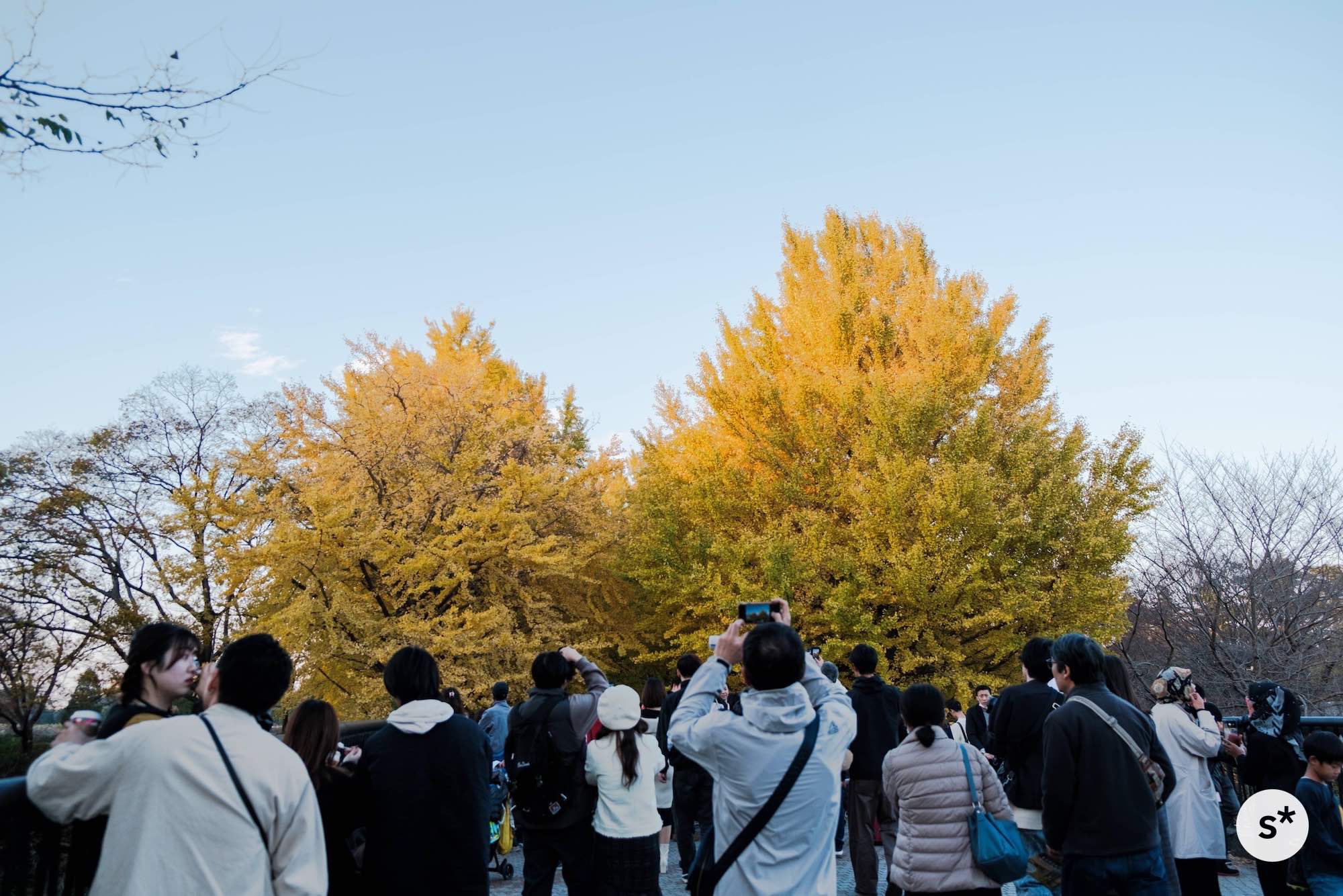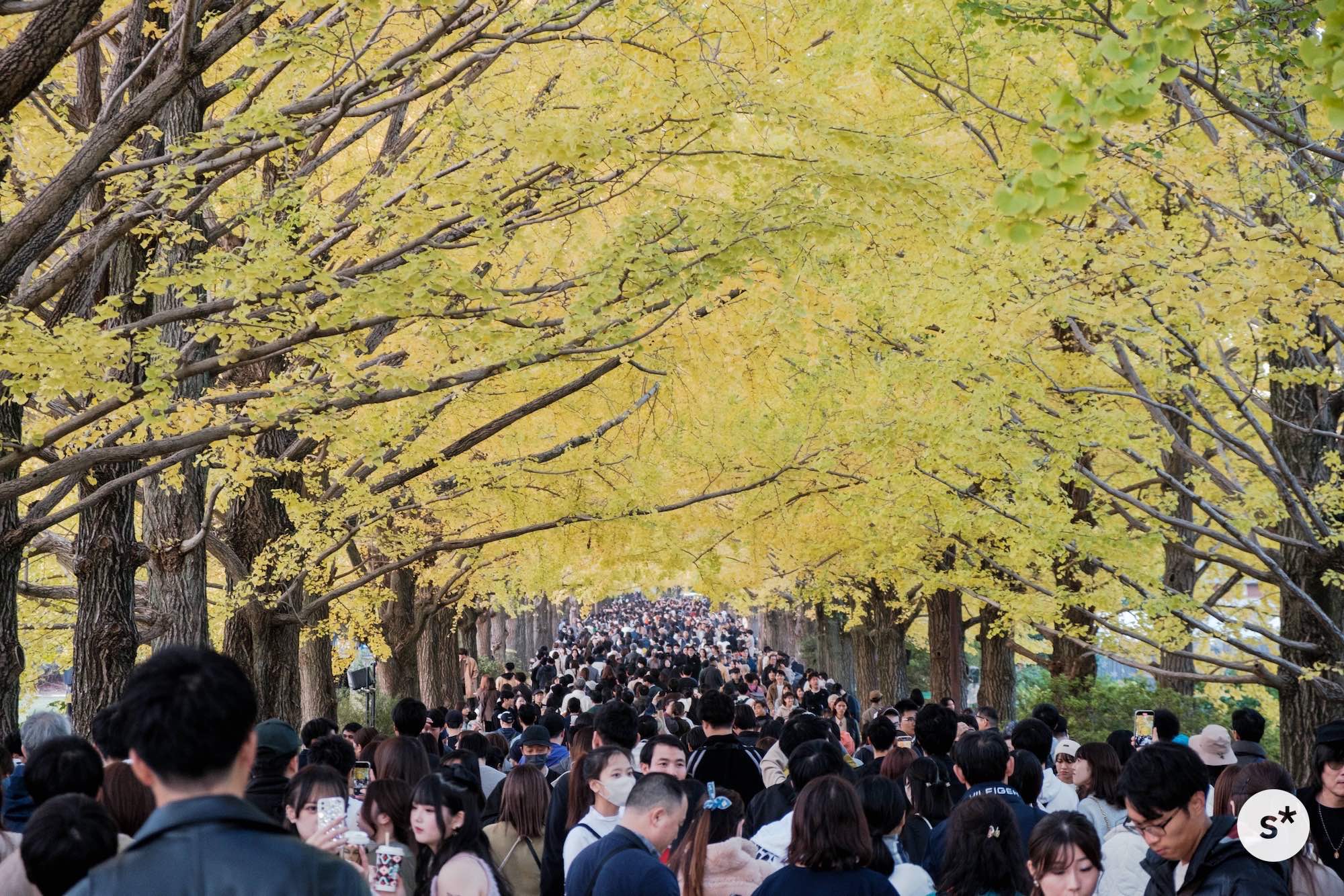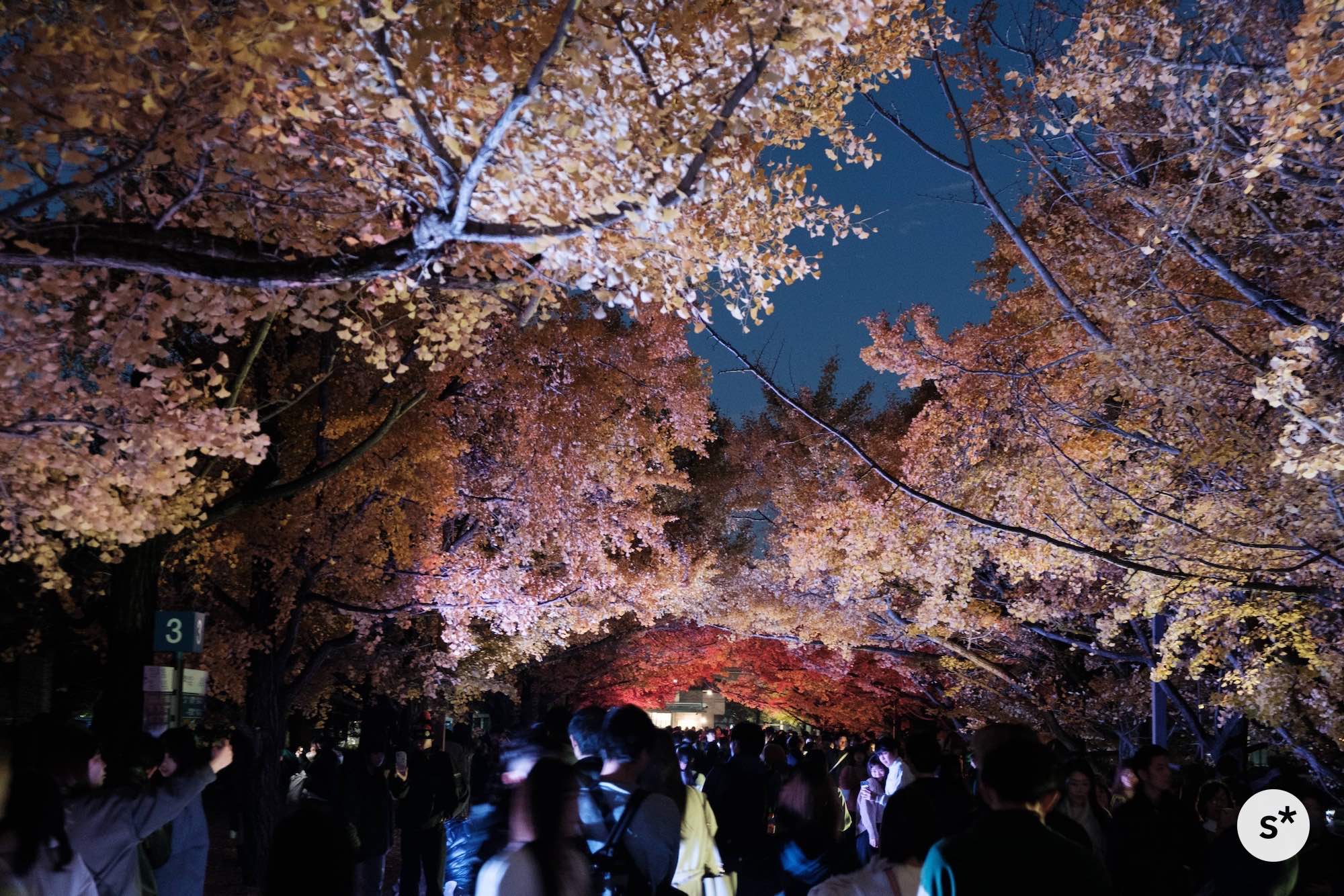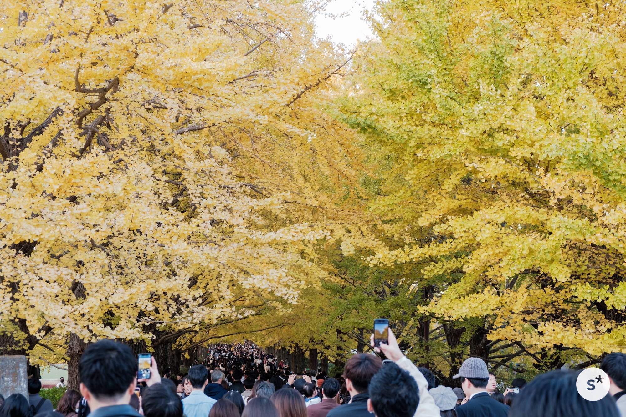 訪れたのは、ちょうど紅葉が見頃を迎えていた祝日。「秋の夜散歩」と銘打ってイチョウ並木と日本庭園のライトアップをやっているから混んでるだろうなと思っていたけれど、案の定激混みでした。