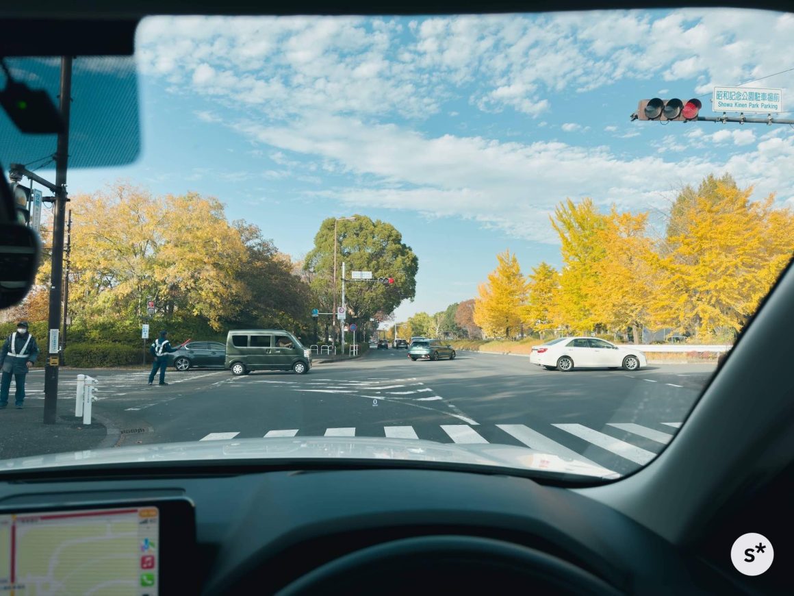 さて、立川口の駐車場から入園口に向かいます。まだ無料エリアなのに既に紅葉がすごいことになっていました。これは見頃のど真ん中なのでは…!
