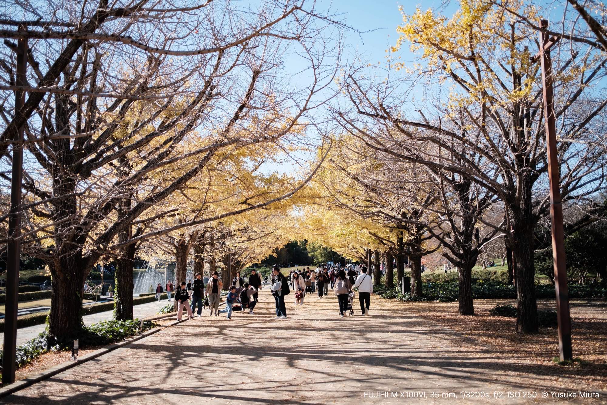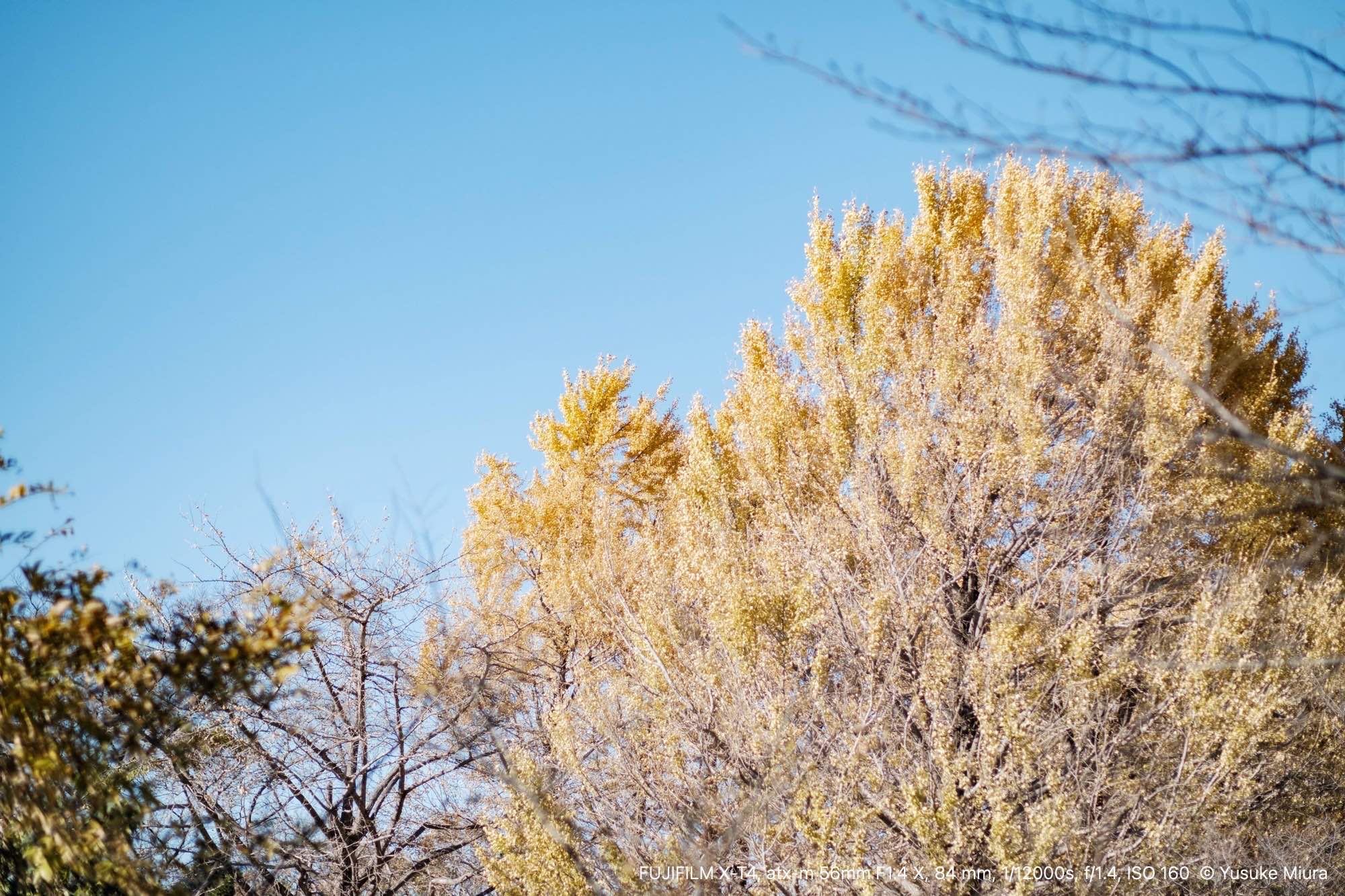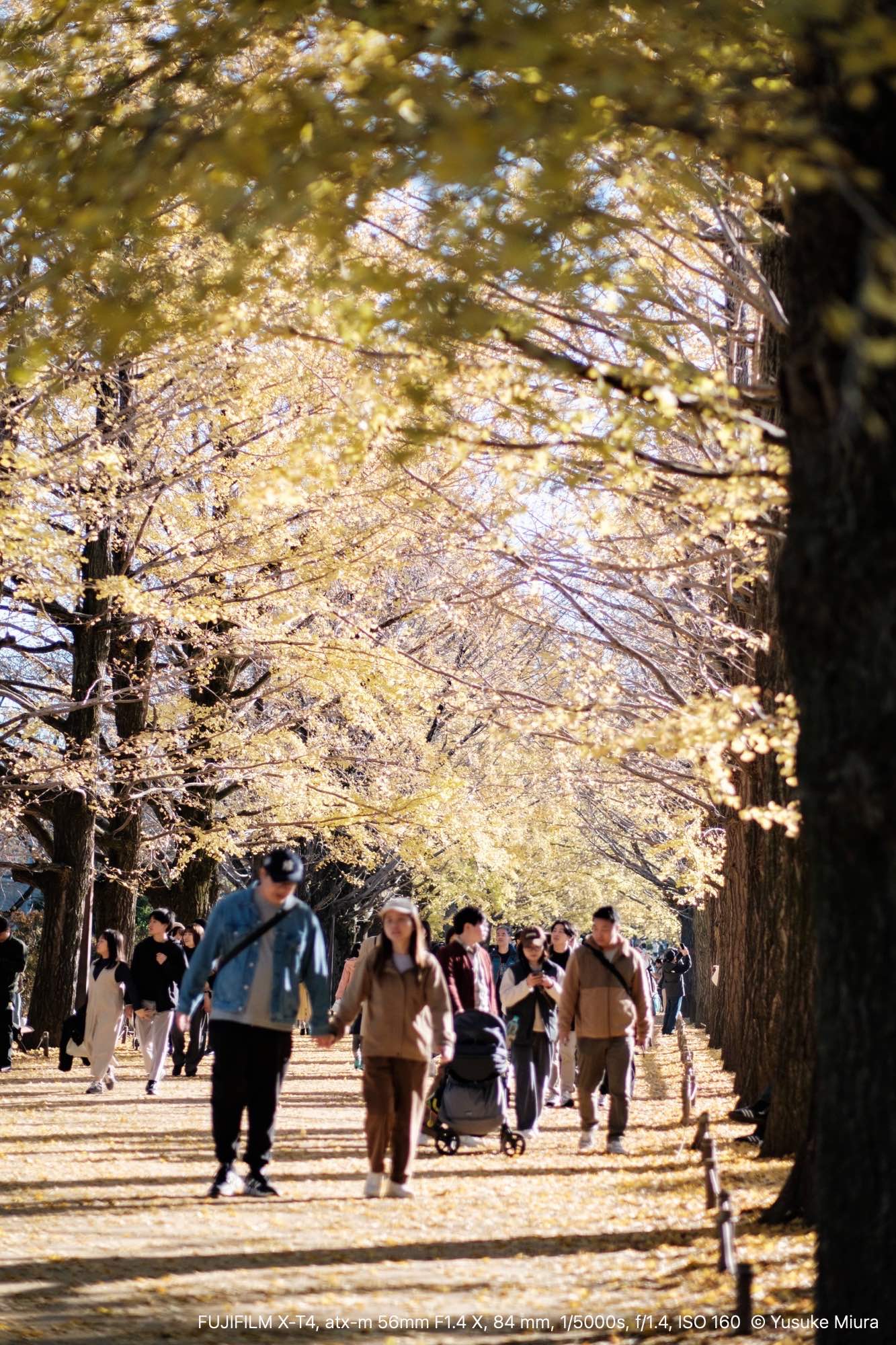 そして、立川口カナールとは異なり、こちらの「かたらいのイチョウ並木」はまだまだ黄色い葉っぱがたくさん残っていました。ところどころ散ってしまっている木ももちろんありますが、中望遠レンズで偽りの見頃を作り出す必要はなさそうです。