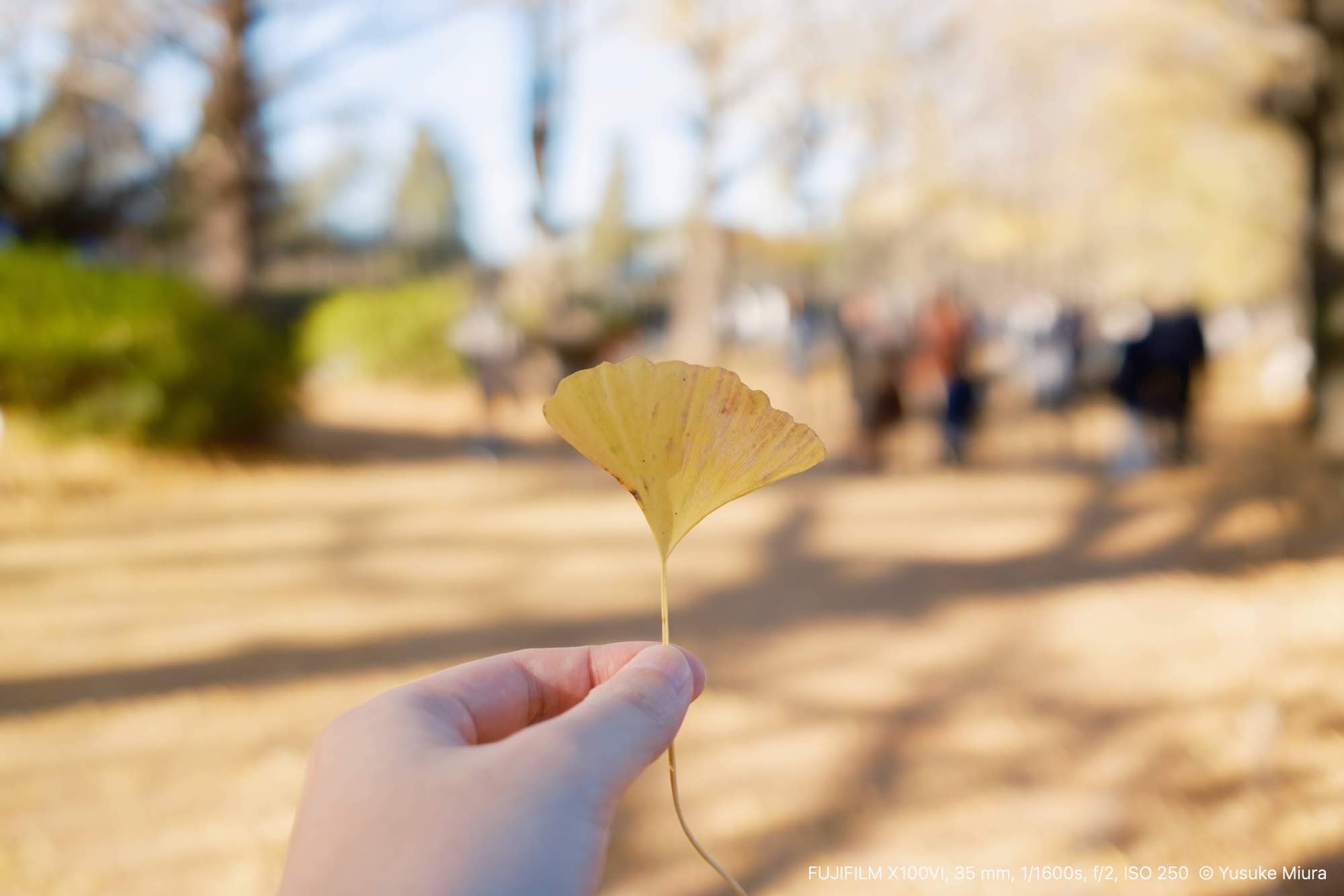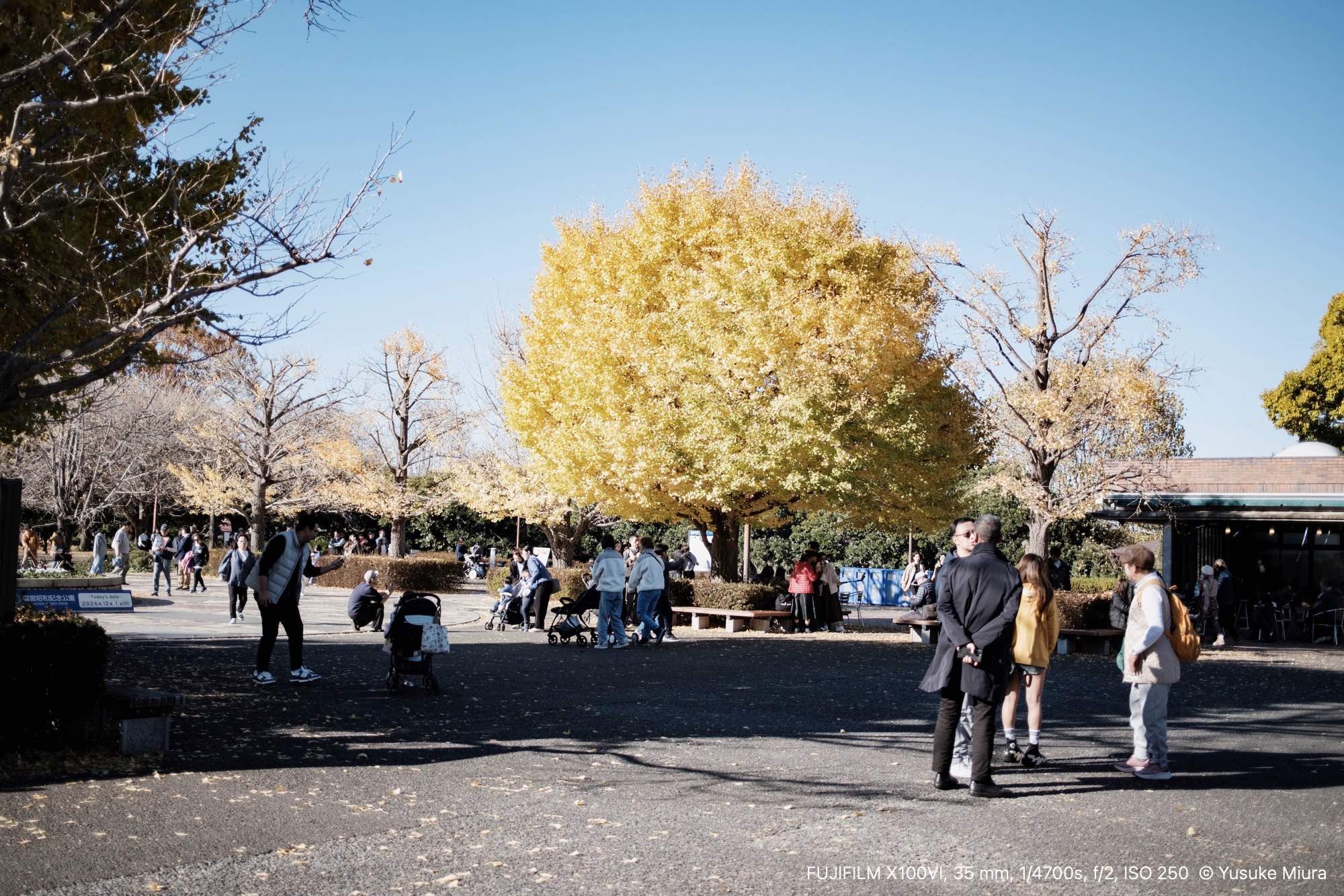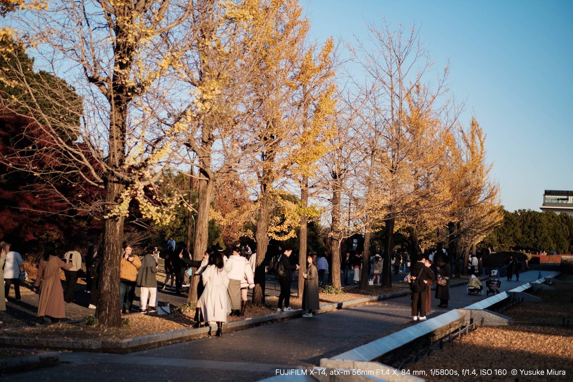 そして、立川口カナールとは異なり、こちらの「かたらいのイチョウ並木」はまだまだ黄色い葉っぱがたくさん残っていました。ところどころ散ってしまっている木ももちろんありますが、中望遠レンズで偽りの見頃を作り出す必要はなさそうです。