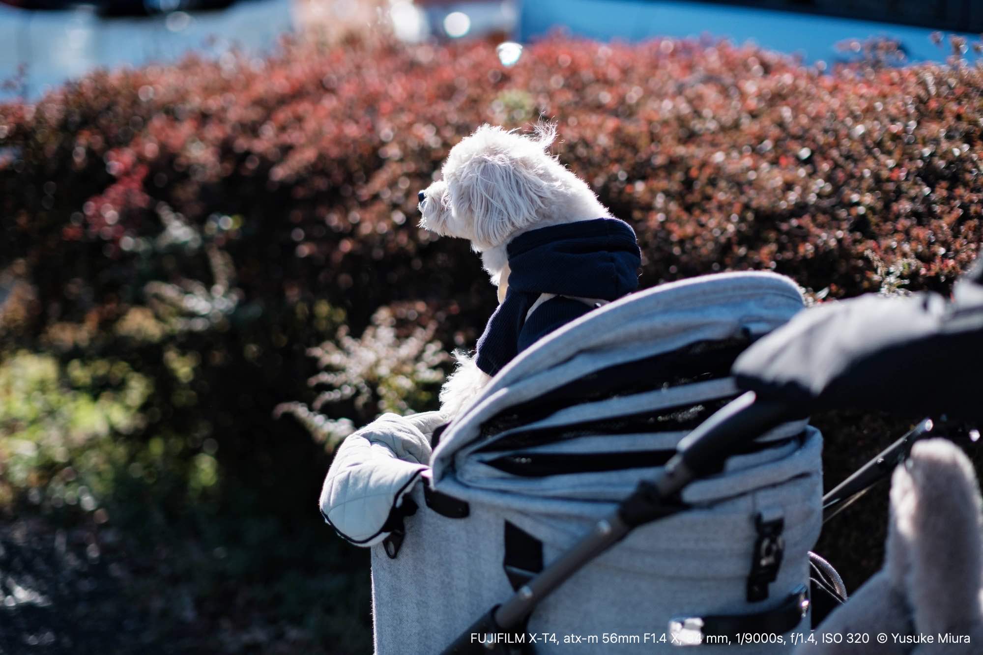 引き続き犬はカートに乗ってもらっているのですが、ちょうど下り坂だったのでジェットコースターのように走って下りてみると、とても楽しそうにしてくれました。カートに乗るの好きだねえ。