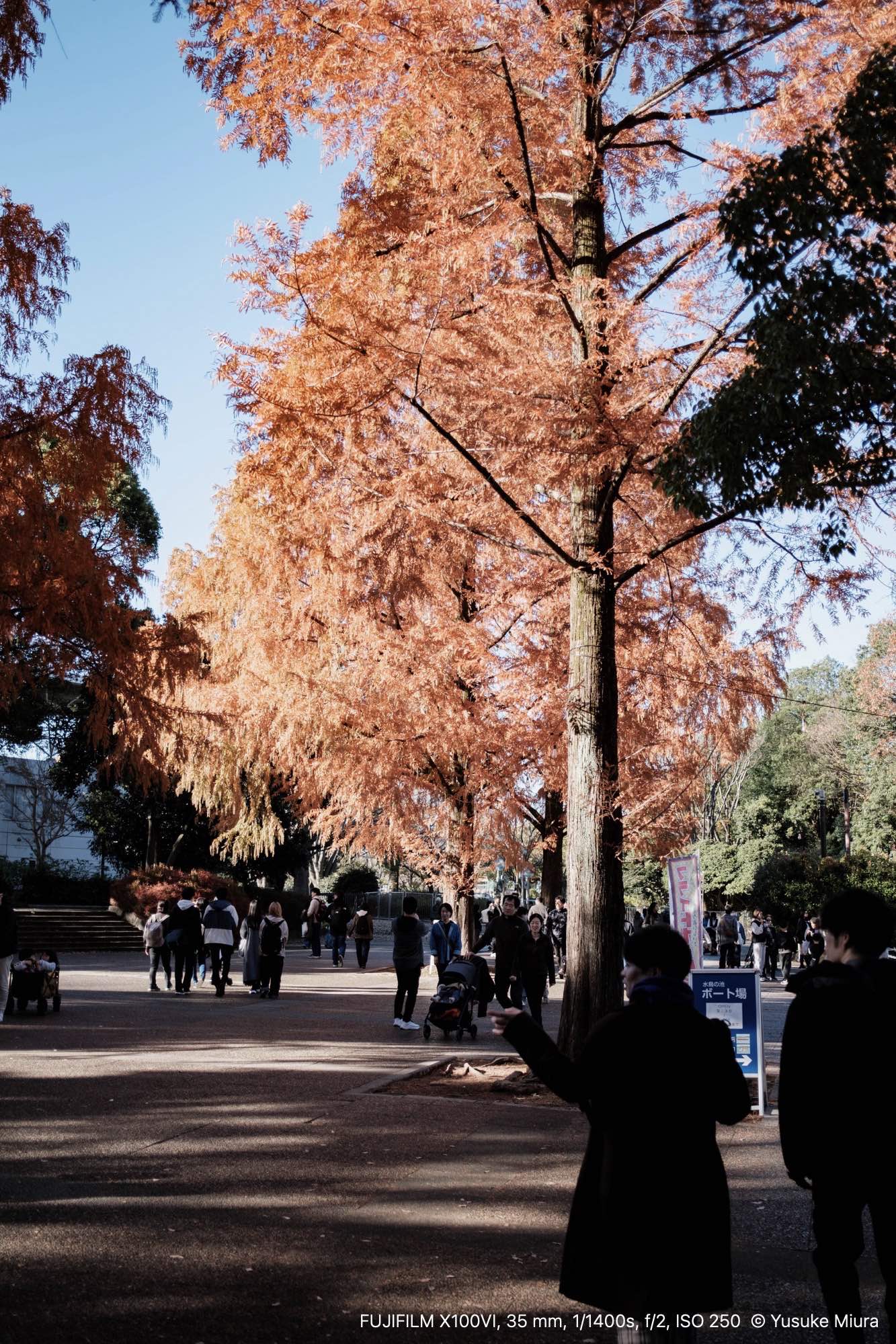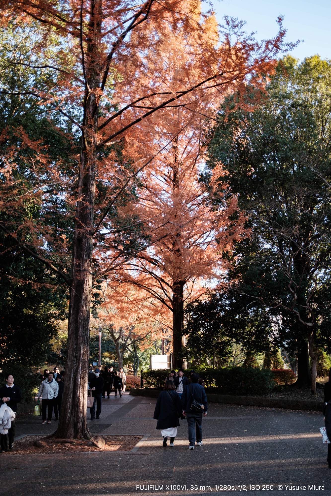 もう少し進むと、大きなメタセコイアの木がいくつもあるエリアに辿り着きました。ちょうど西立川口のところです。ここのメタセコイアはどの木も見頃で、思わず顔を上げながら横を通ります。