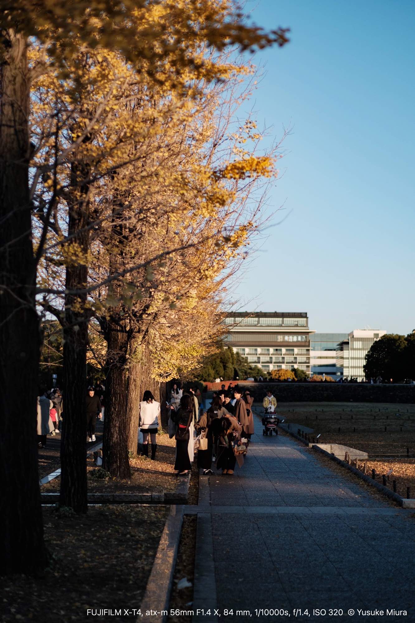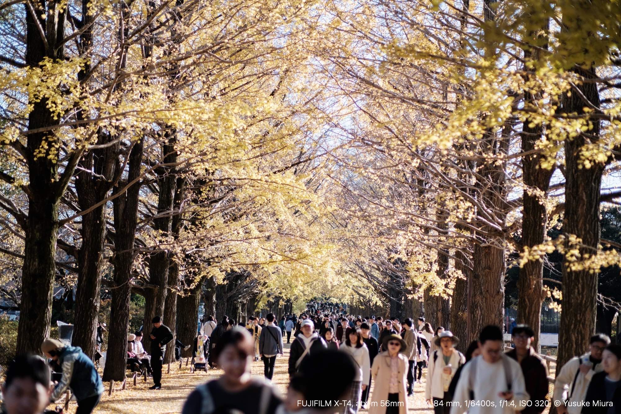 さて、ここのイチョウ並木も一部だけ見頃の(ように見える)木がありました。ここでも中望遠レンズによる切り取りマジック発動です。完璧だ。