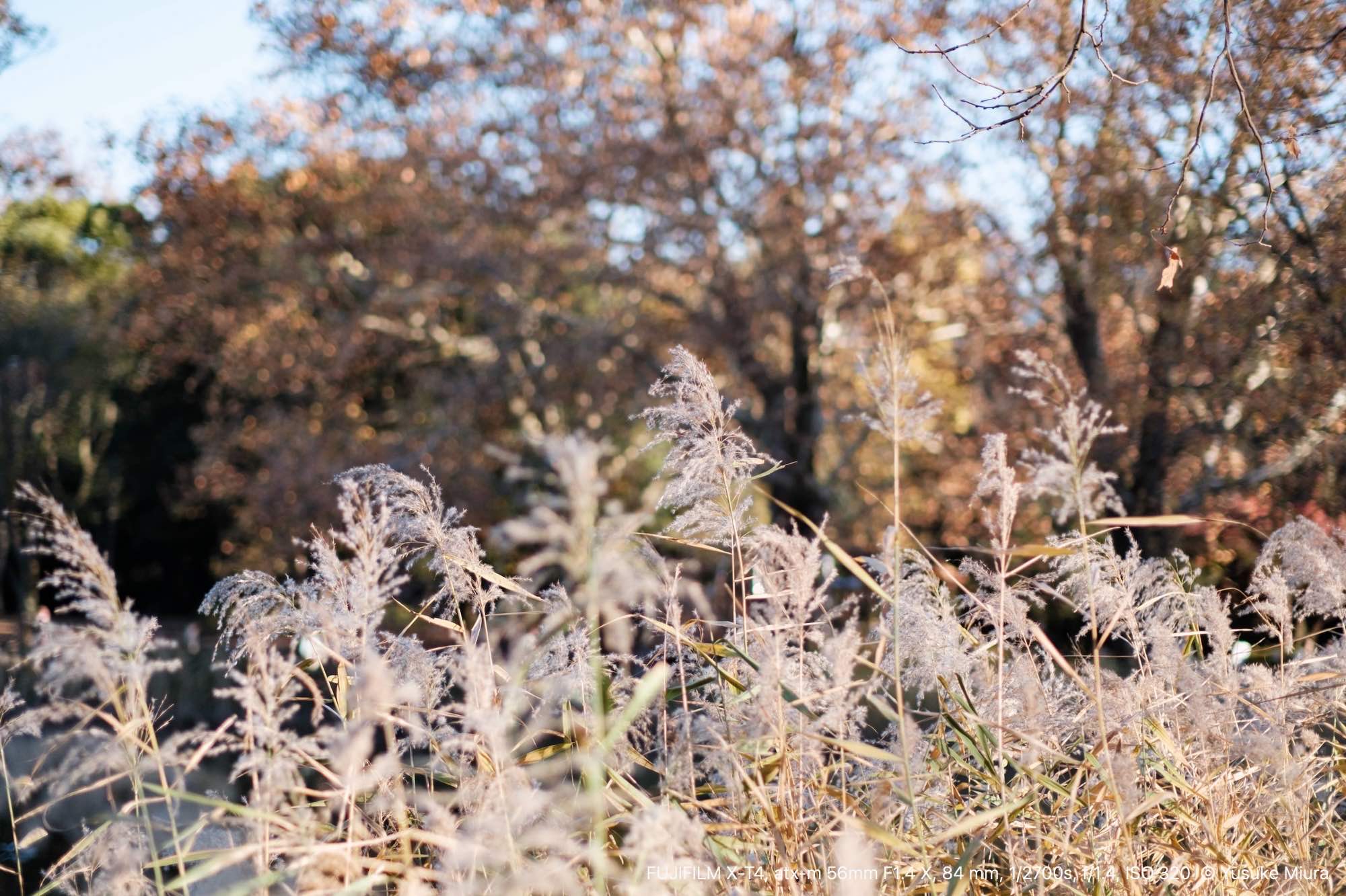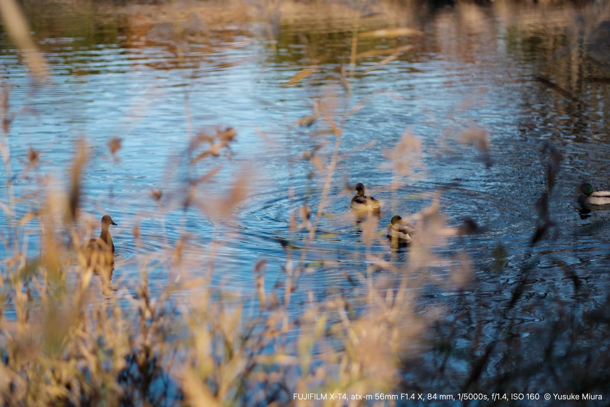 ススキを撮っていると、その奥に水鳥(鴨なんですかね?)たちが優雅に泳いでいました。咄嗟にマニュアルフォーカスに切り替えて、ススキの向こうの鳥さんにピントを合わせます。
