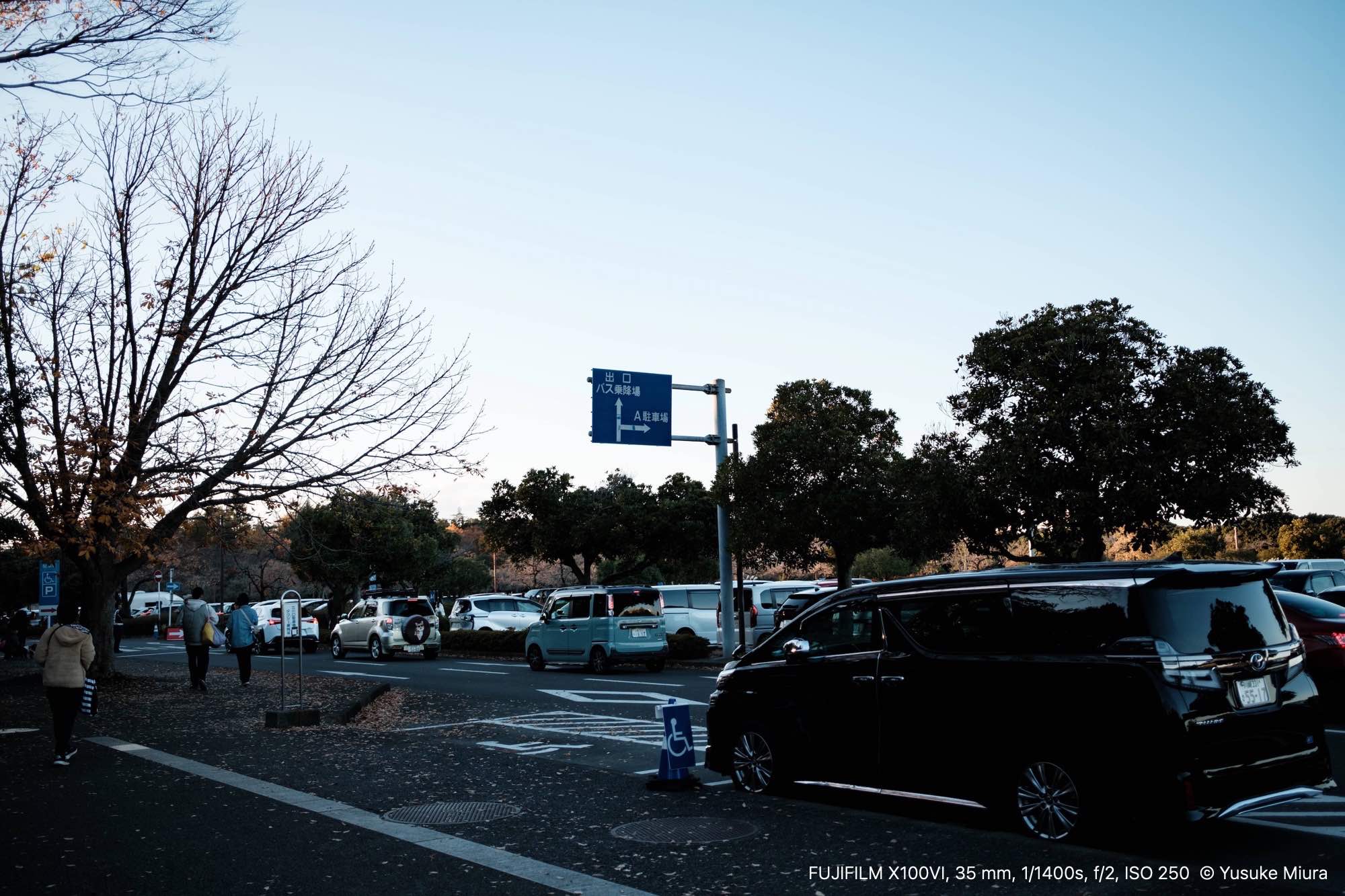 さて、紅葉シーズンも終わりつつあるということで、見頃のど真ん中で訪れている例年と比べると車も少なめでした。入場口に割と近いところも空いてましたが、敢えて離れたところに止めました。ドアパン対策です。