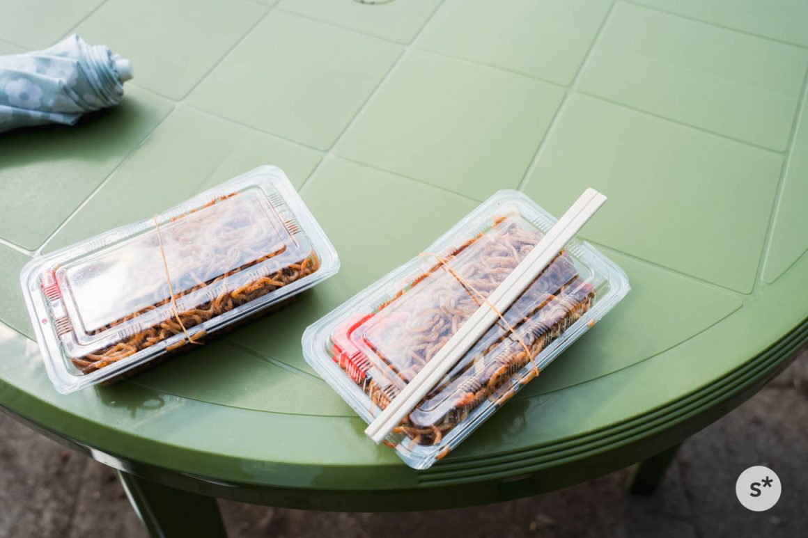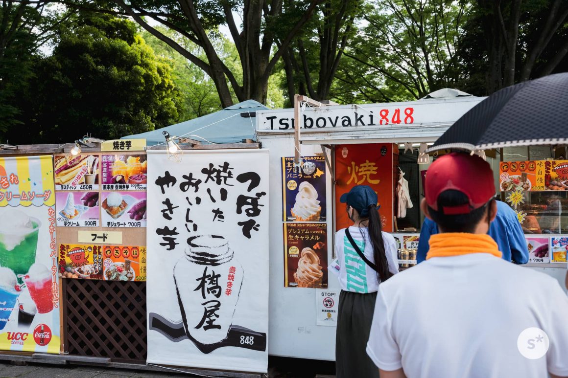 さらに進み、ふれあい橋を渡って水鳥の池の前には屋台が並んでいます。そういえばお昼ご飯を食べていなかったので、ここで焼きそばを買いました。(焼き芋が主力っぽいお店で焼きそばを買うのは少し気が引けたけど)