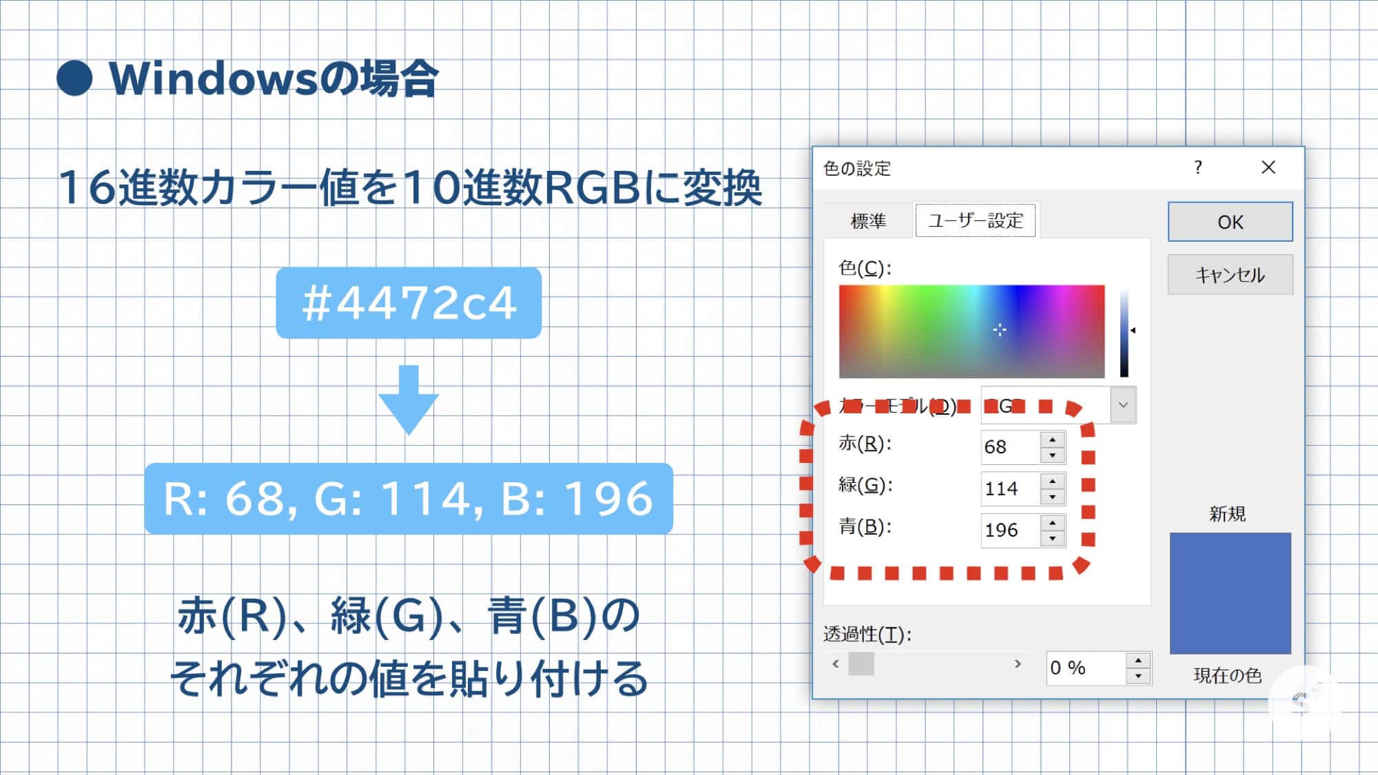 一方、Windowsはそのまま扱うことができないので、いったん10進数のRGBに変換します。