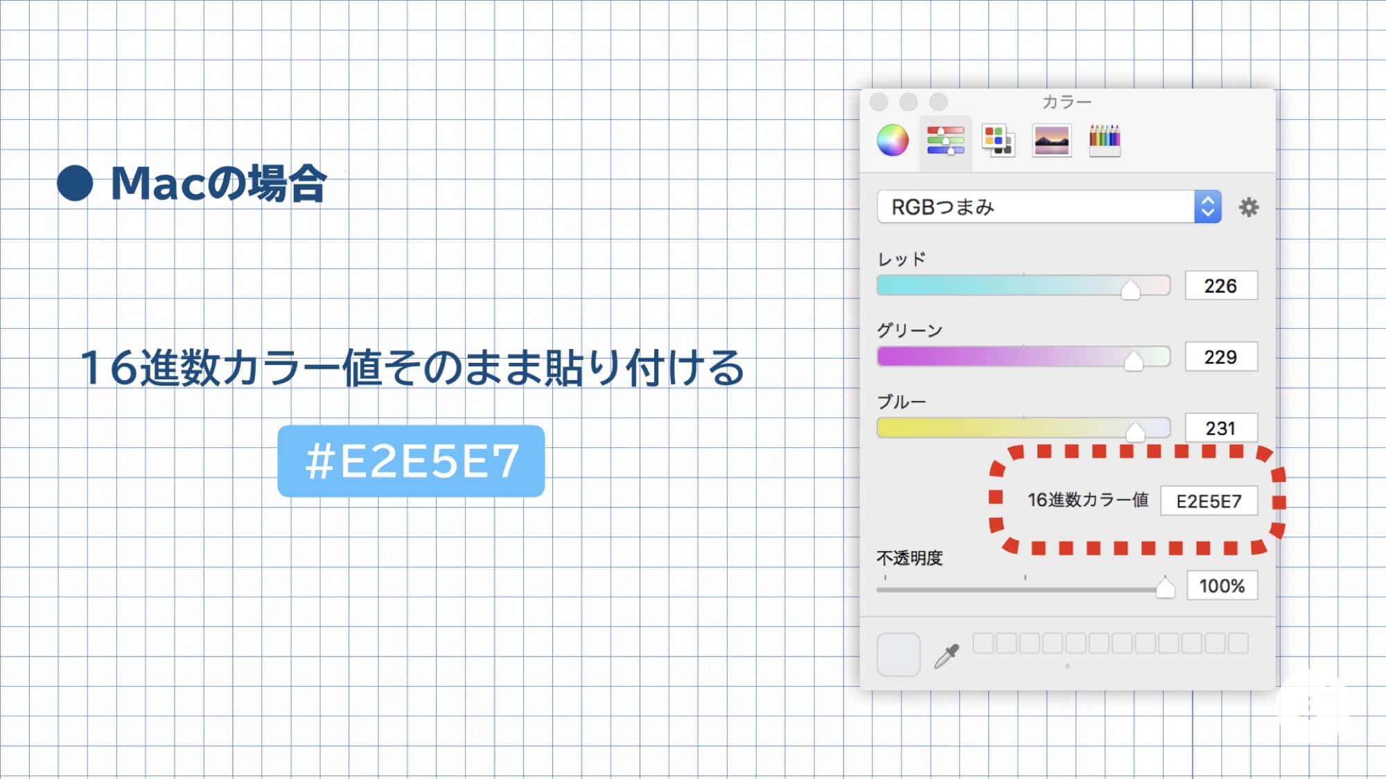 Mac場合は、カラーピッカーの「16進数カラー値」にそのまま貼り付けるだけ。