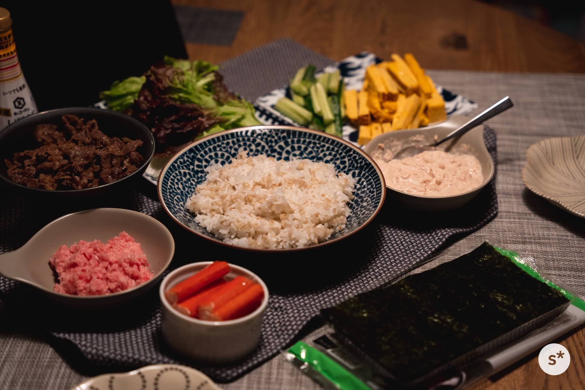 節分は恵方巻きの代わりに、手巻き寿司パーティーをしました。昨年もやったのですが、今年はテーブルが広くなったので具材も増えて豪華になりました。いい和牛のお肉も買っちゃった。