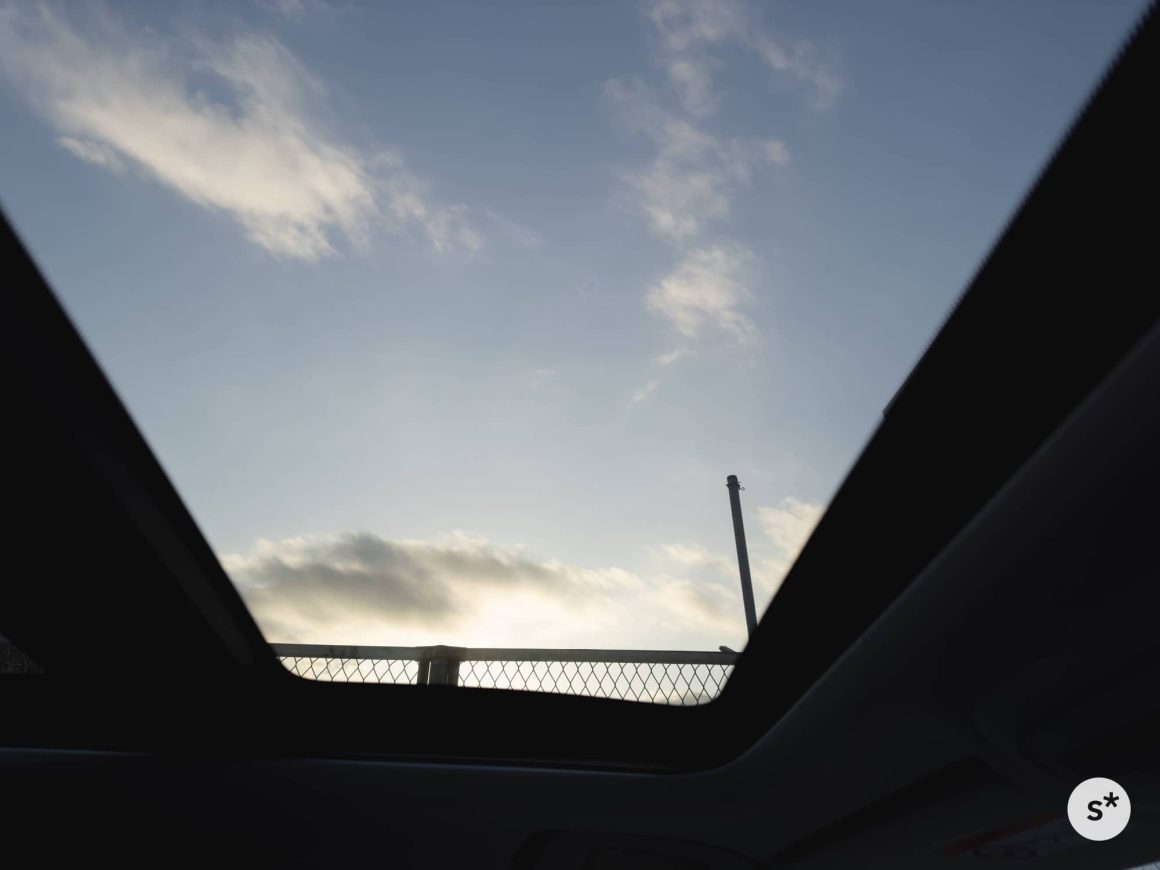車のサンルーフから見えた空。夕焼けになる前の、青と白のグラデーションが素敵で、信号待ちで思わず撮りました。iPhone 14 Pro Maxで撮影。
