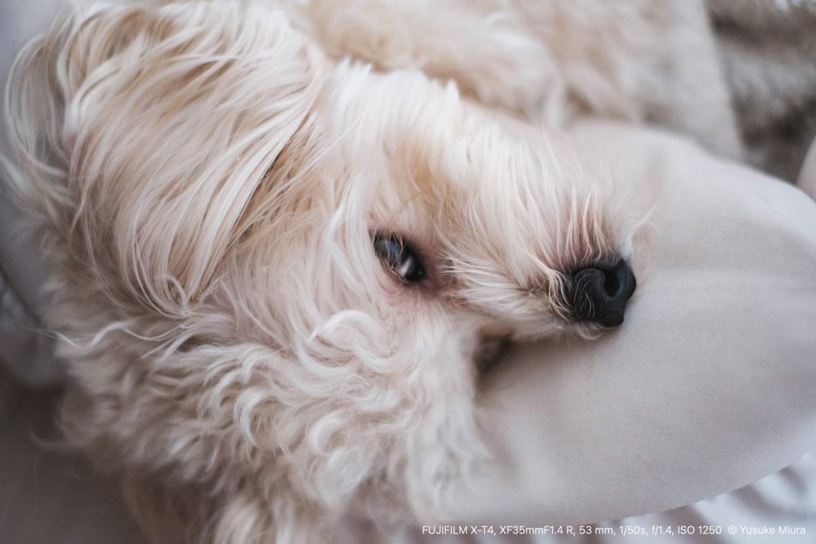 書斎には犬がくつろげるようにベッドを置いています。僕らが在宅勤務中はずっとそこで寝ていることが多くて、たまに起きては寝ぼけてぼーっとしていることもあって、とてもかわいい。そのときに撮った1枚。
