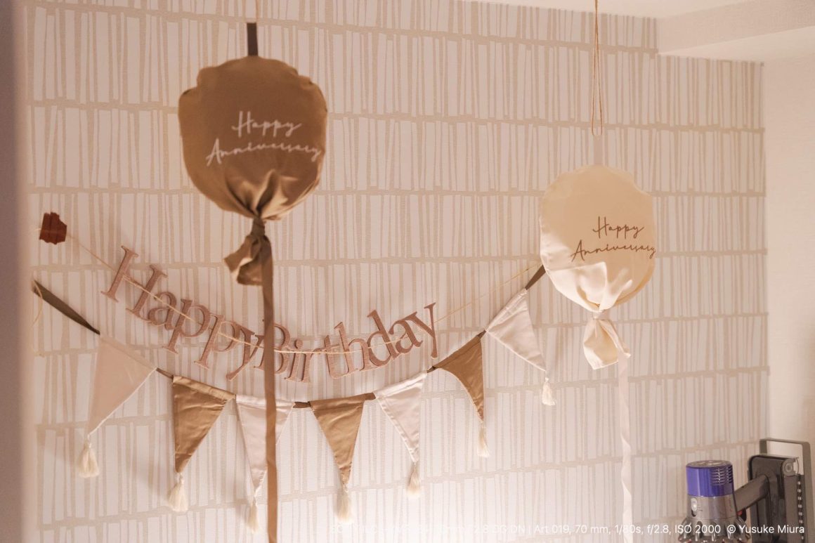 そして背景の飾りは妻が3COINSで買ってきてくれたものです。僕が試行錯誤しながら飾り付けしたら、こうなりました。もう少しちゃんと考えればよかったかな。でも平日の仕事終わりに急いでやったから仕方ないね。