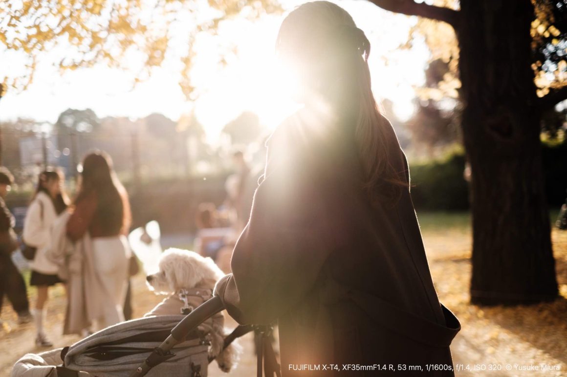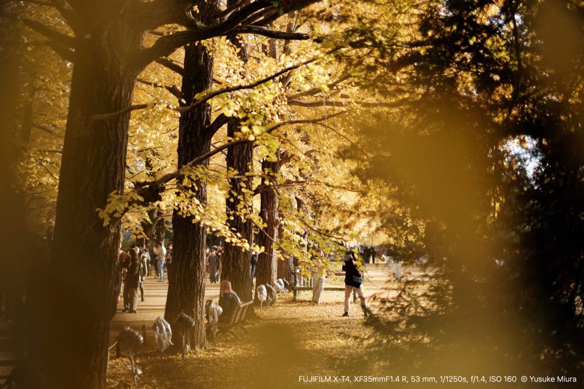 昭和記念公園「かたらいのイチョウ並木」で撮影した1枚。夕日に照らされて光り輝くイチョウ並木を、イチョウの葉の隙間から覗き込みました。