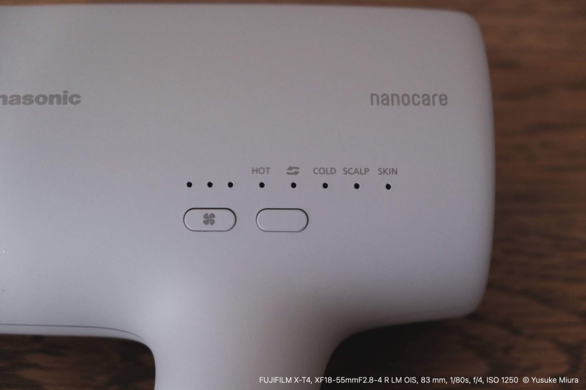 このナノケアは、風量と温度を別々に制御することができます。風量は3段階、温度にはいくつかのモードがあり肌への負担を軽減できるそうで。温風と冷風を交互に繰り返すリズムモードや、地肌にやさしい低めの温度(60℃)の風が出てくるスカルプモードなどがあります。