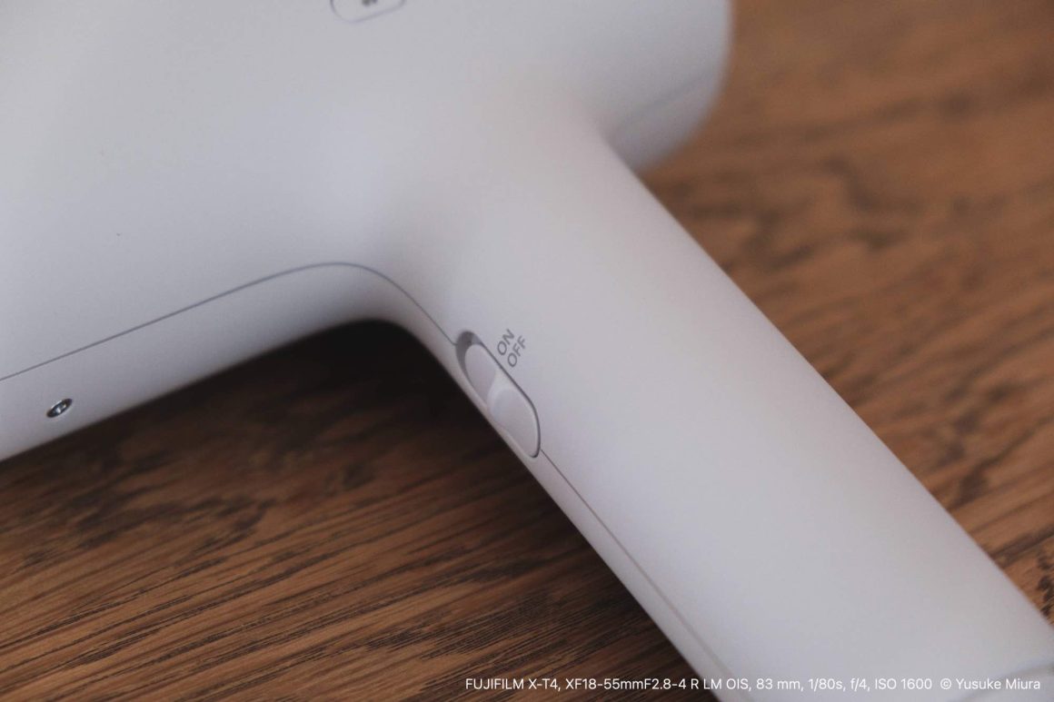 風量と温度の切り替えは側面のボタンで行います。右手でドライヤーを持ったときに人差し指を伸ばした位置にあるので、慣れると手探りで操作できるようになります。